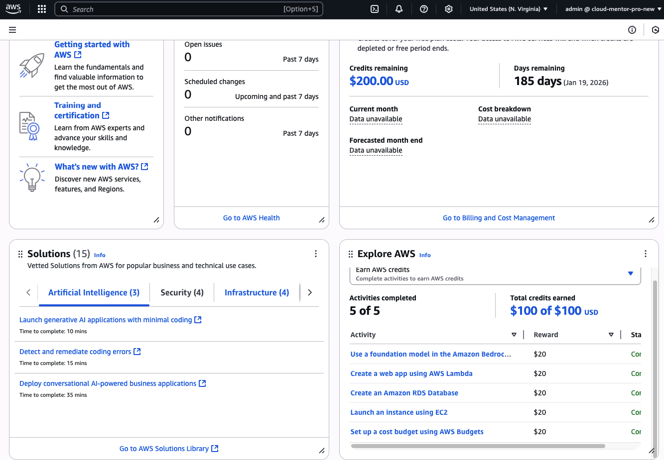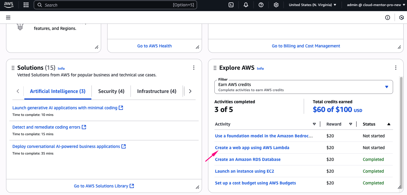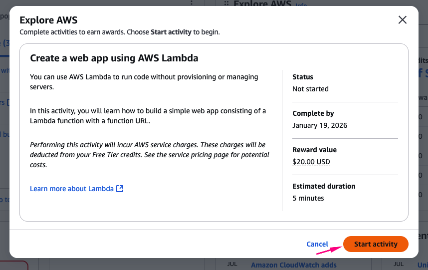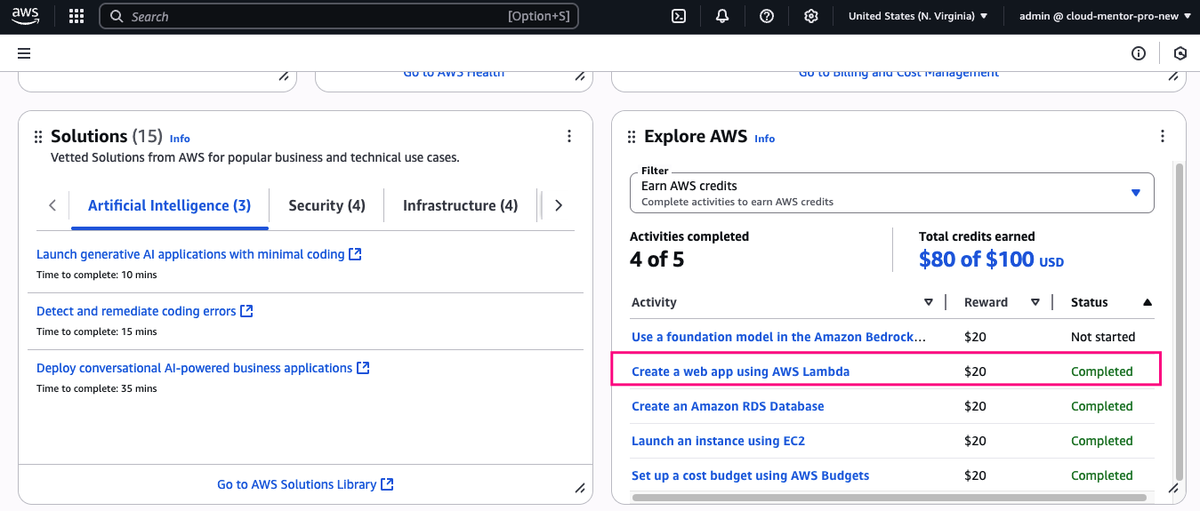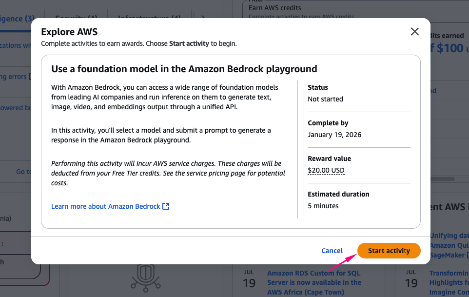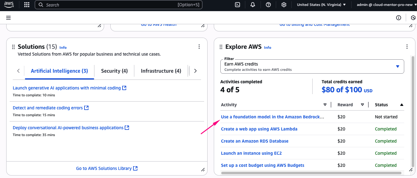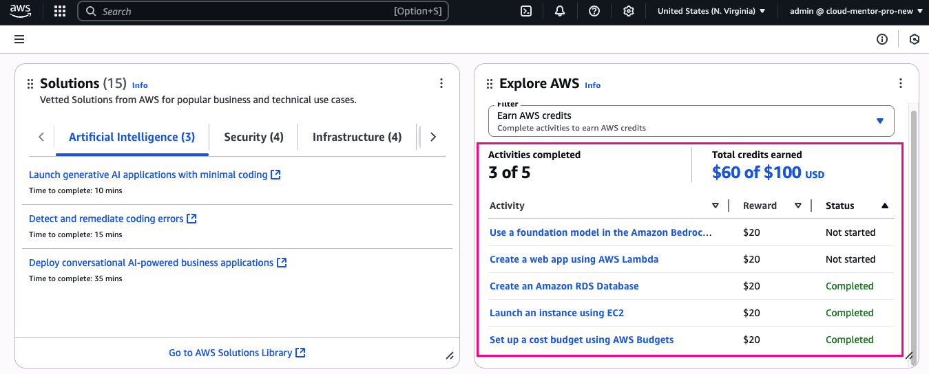 Để nhận thêm 100 USD credits, bạn cần hoàn thành 5 bài lab đơn giản, được thiết kế để giúp người mới làm quen với các service cơ bản của AWS. Mỗi bài hoàn thành, bạn nhận 20$ credit.