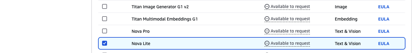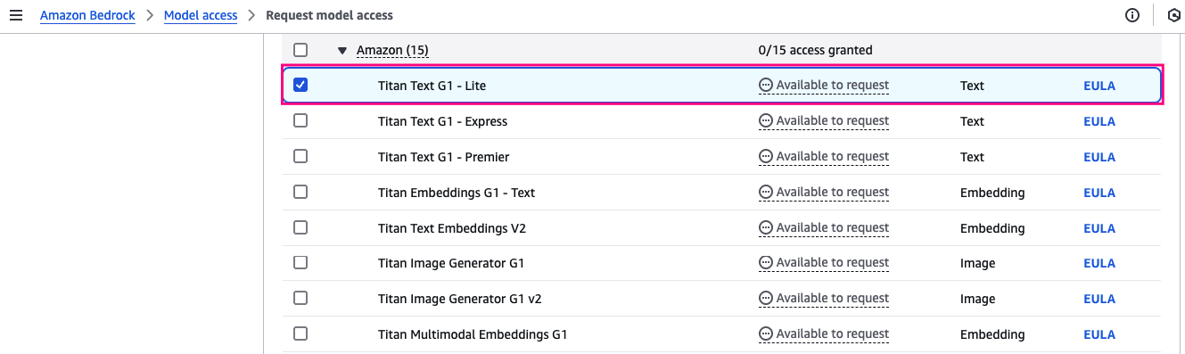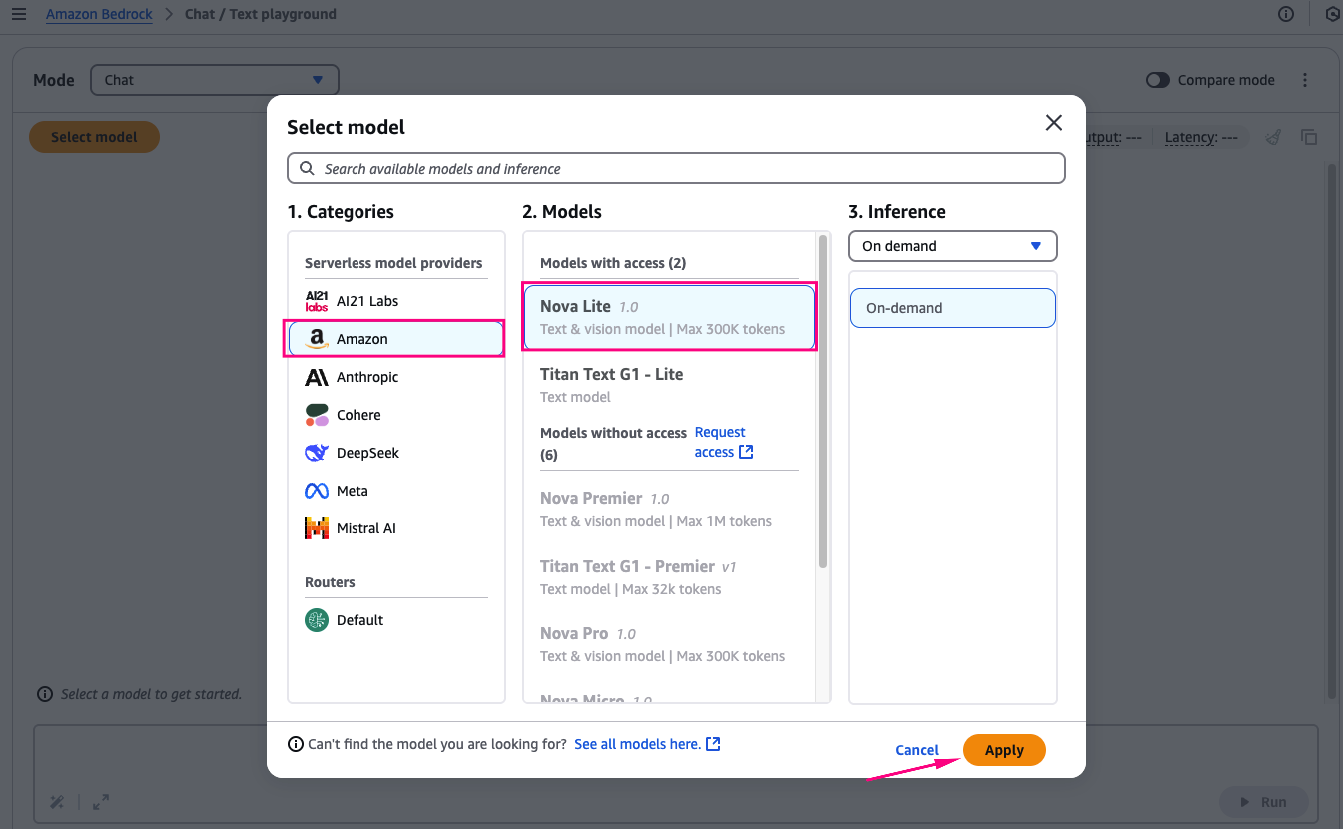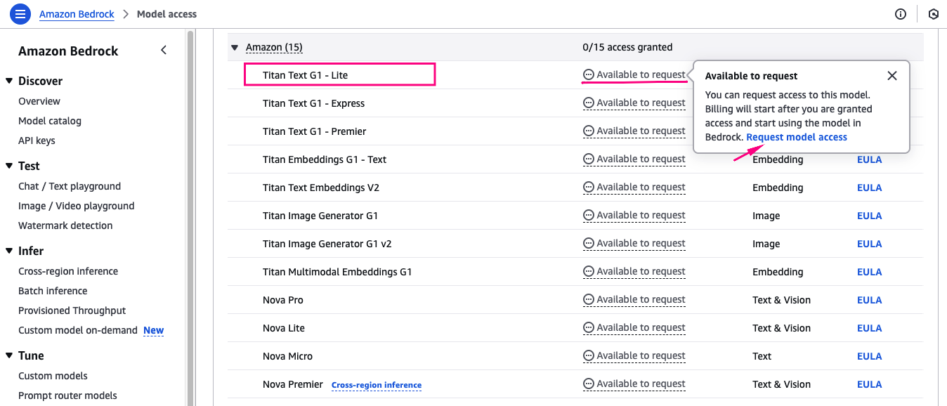Chọn các model của Amazon (ví dụ: Nova Lite, Titan Text G1 - Lite) à Request