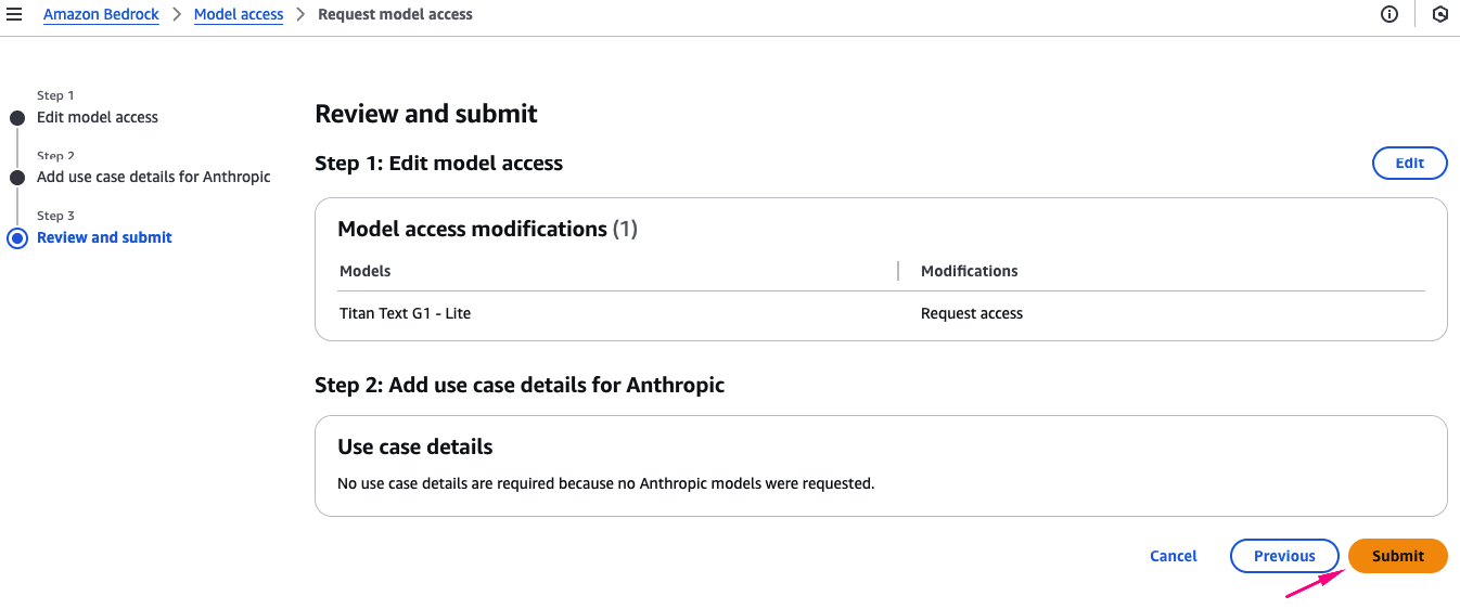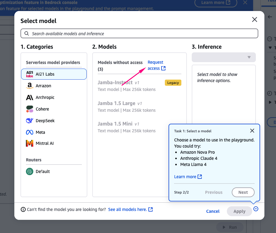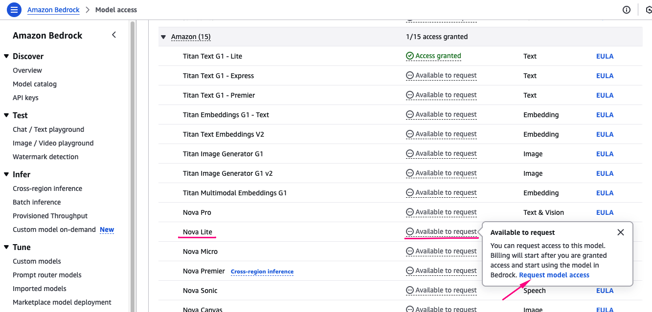 Nếu đây là lần đầu bạn dùng Bedrock, bạn sẽ cần yêu cầu cấp quyền truy cập model (Quan trọng)