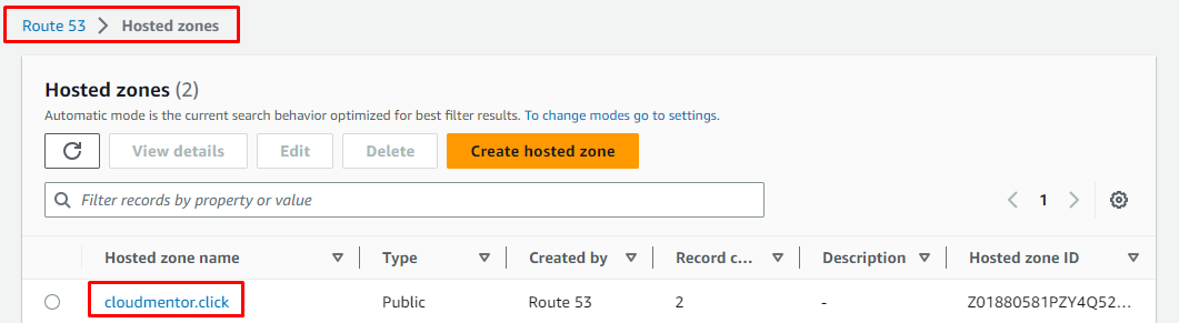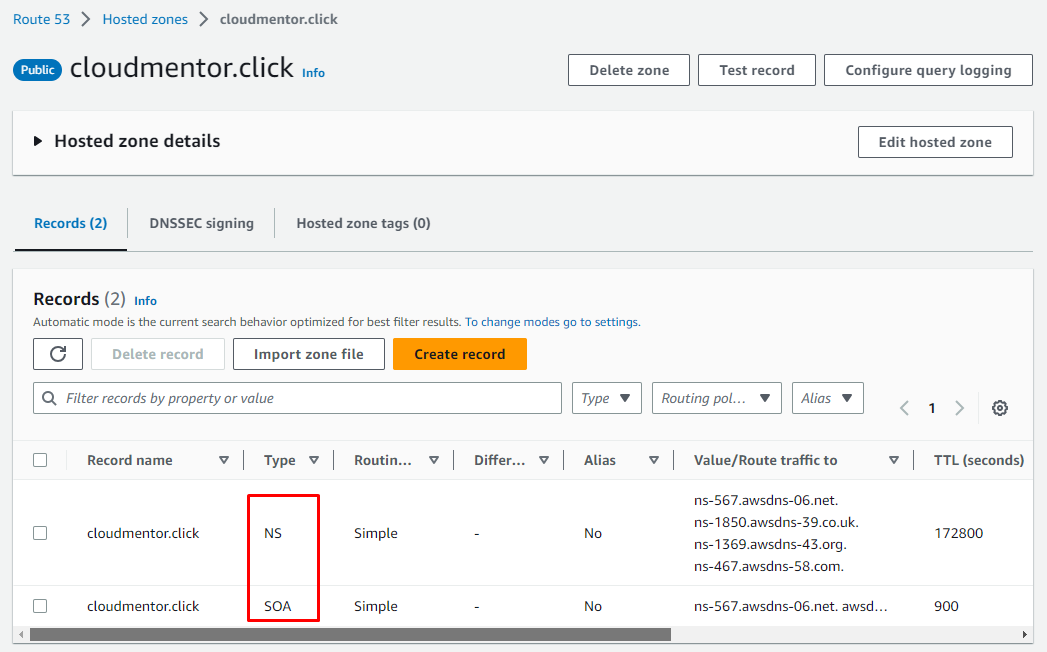 Vào Console Route53 -> Hosted zones -> Click vào Hosted zone mà bạn đã tạo. (Khi mua domain tại Route53 thì default cũng sẽ dc tạo public hosted zone với tên là tên domain).