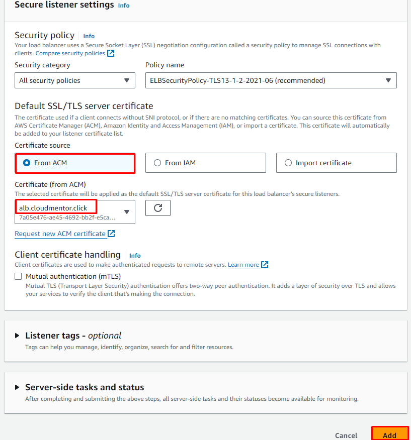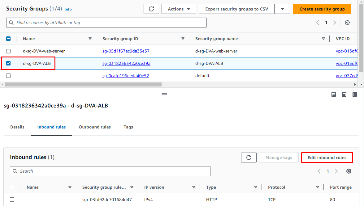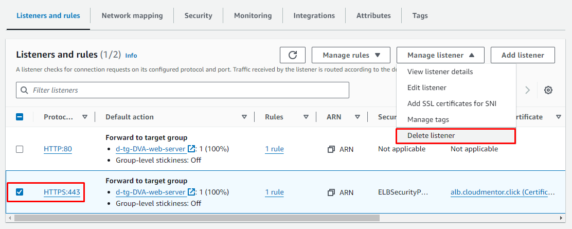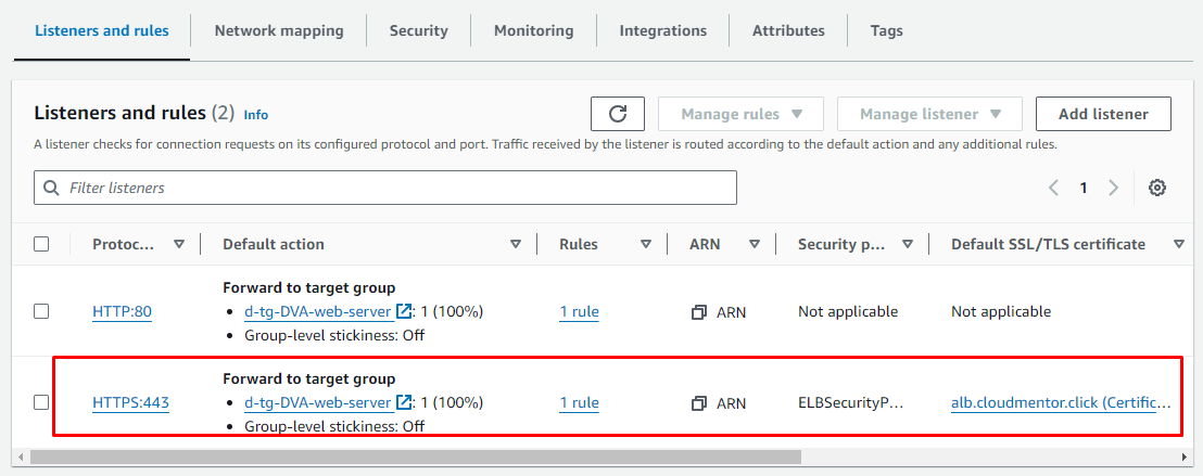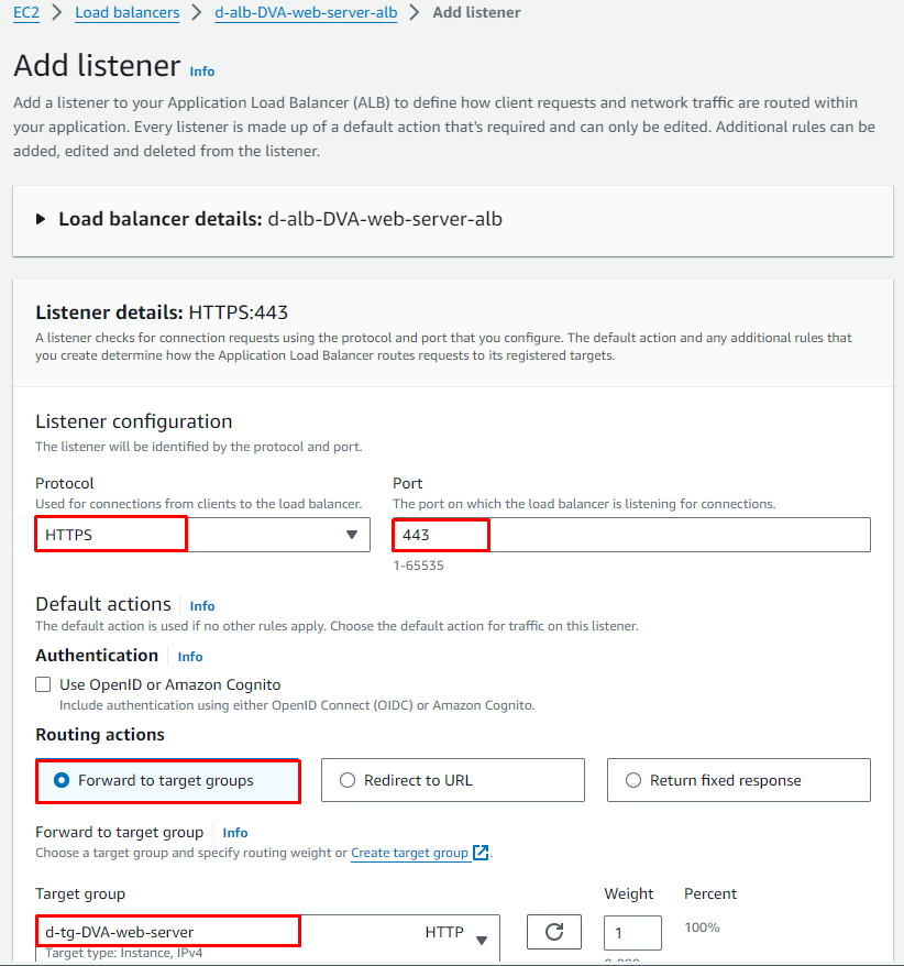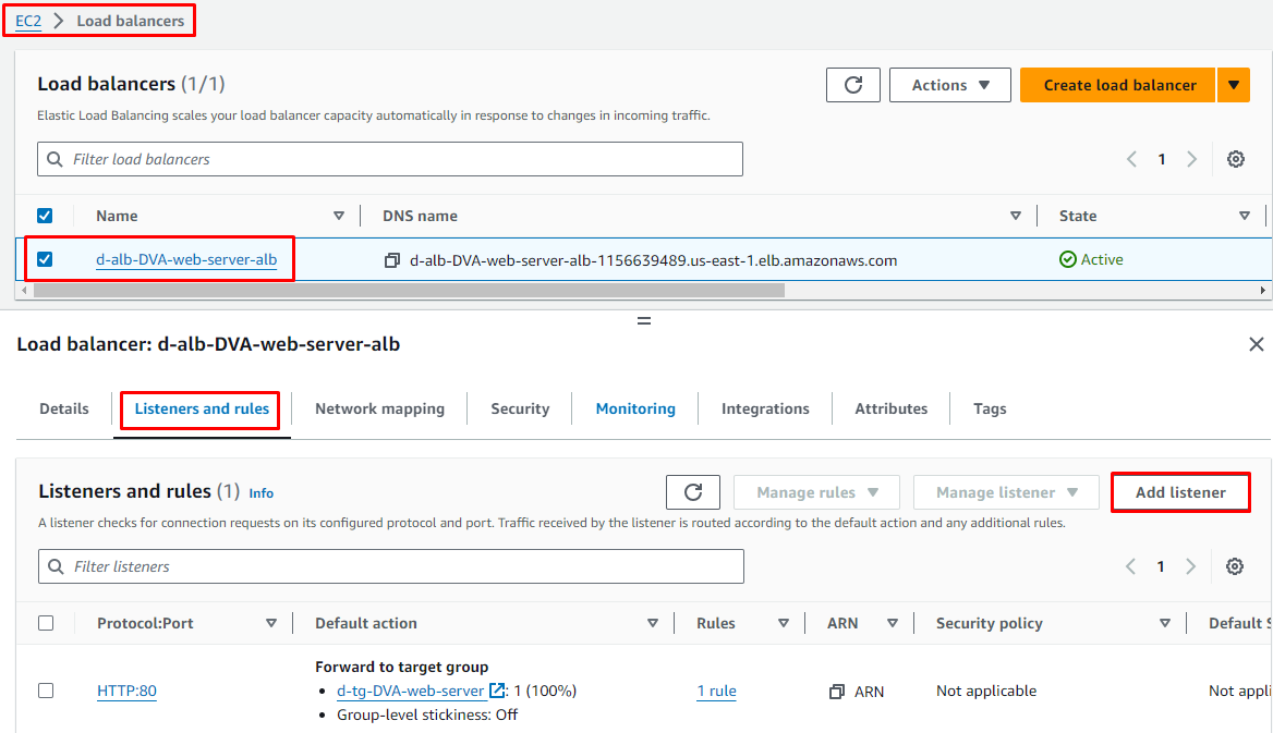 Vào Console EC2 -> Load balancers -> Chọn d-alb-DVA-web-server-alb. Click Tab Listeners and rules -> Add listener