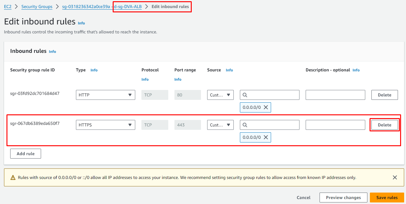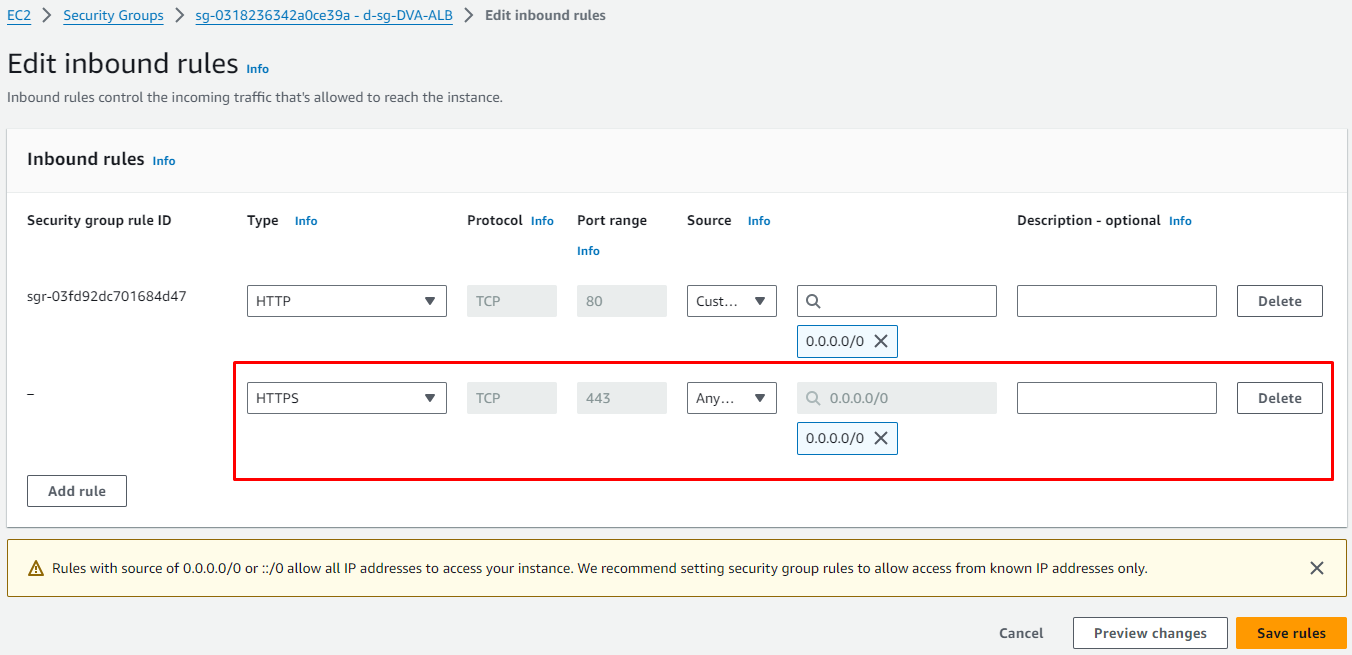 - Add rule cho security group của ALB, cho phép access port 443 từ internet