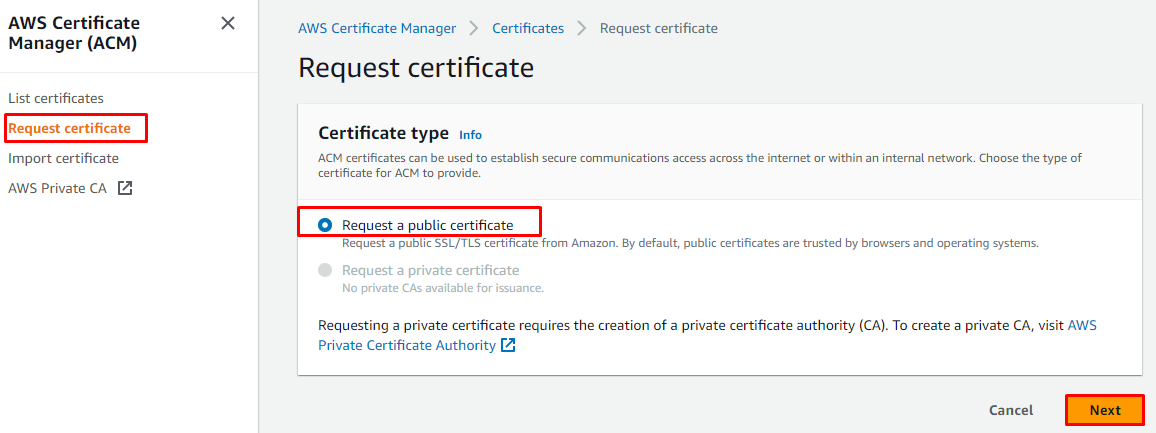 Tại Console của AWS Certificate Manager -> Click Request certificate -> Next