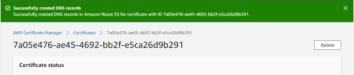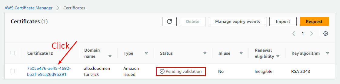 Certificate đang ở trạng thái Pending validation, CLick vào Certificate ID