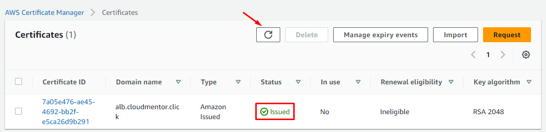 Quay về lại trang Certificates, Nếu Status vẫn chưa ở trang thái Issued thì bạn đợi tầm vài giây hoặc nhấn refresh