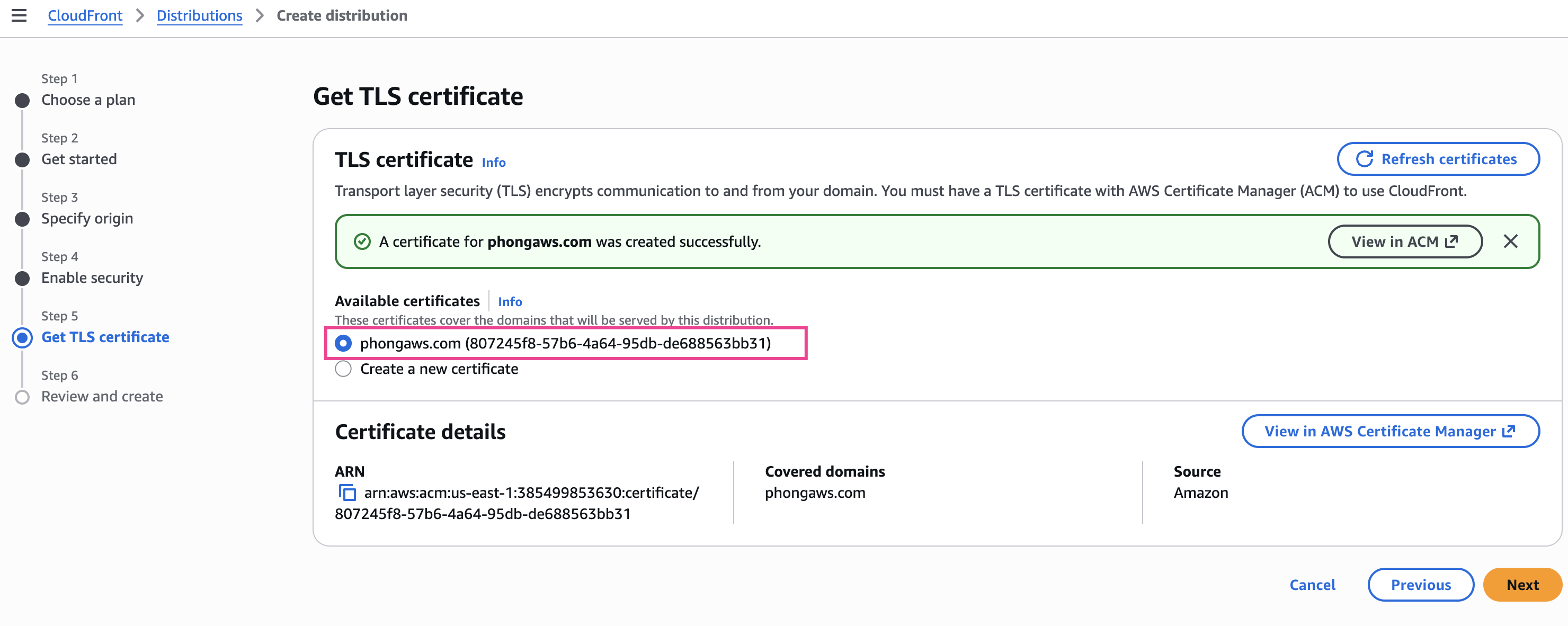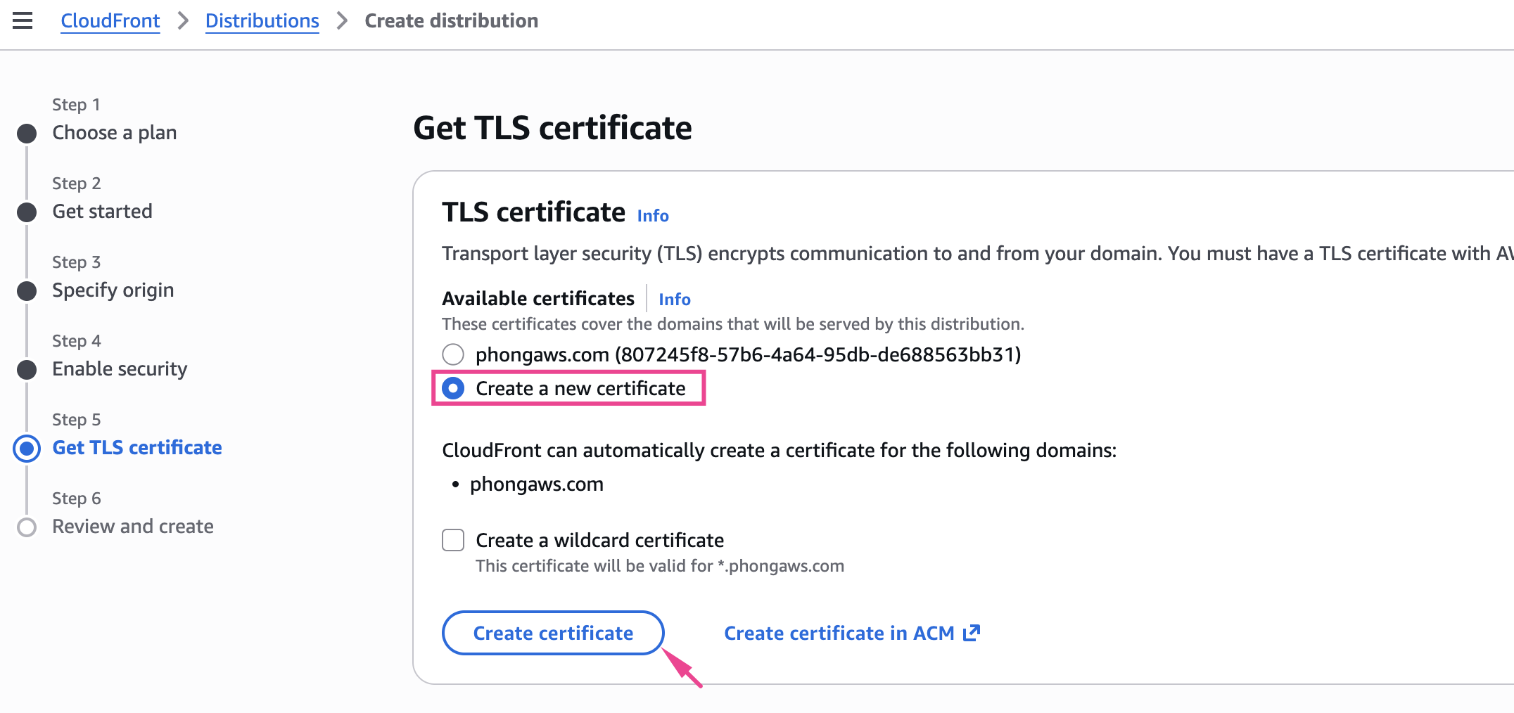 - Chọn Create a new certificate: CloudFront sẽ request ACM certificate mới cho domain của bạn
