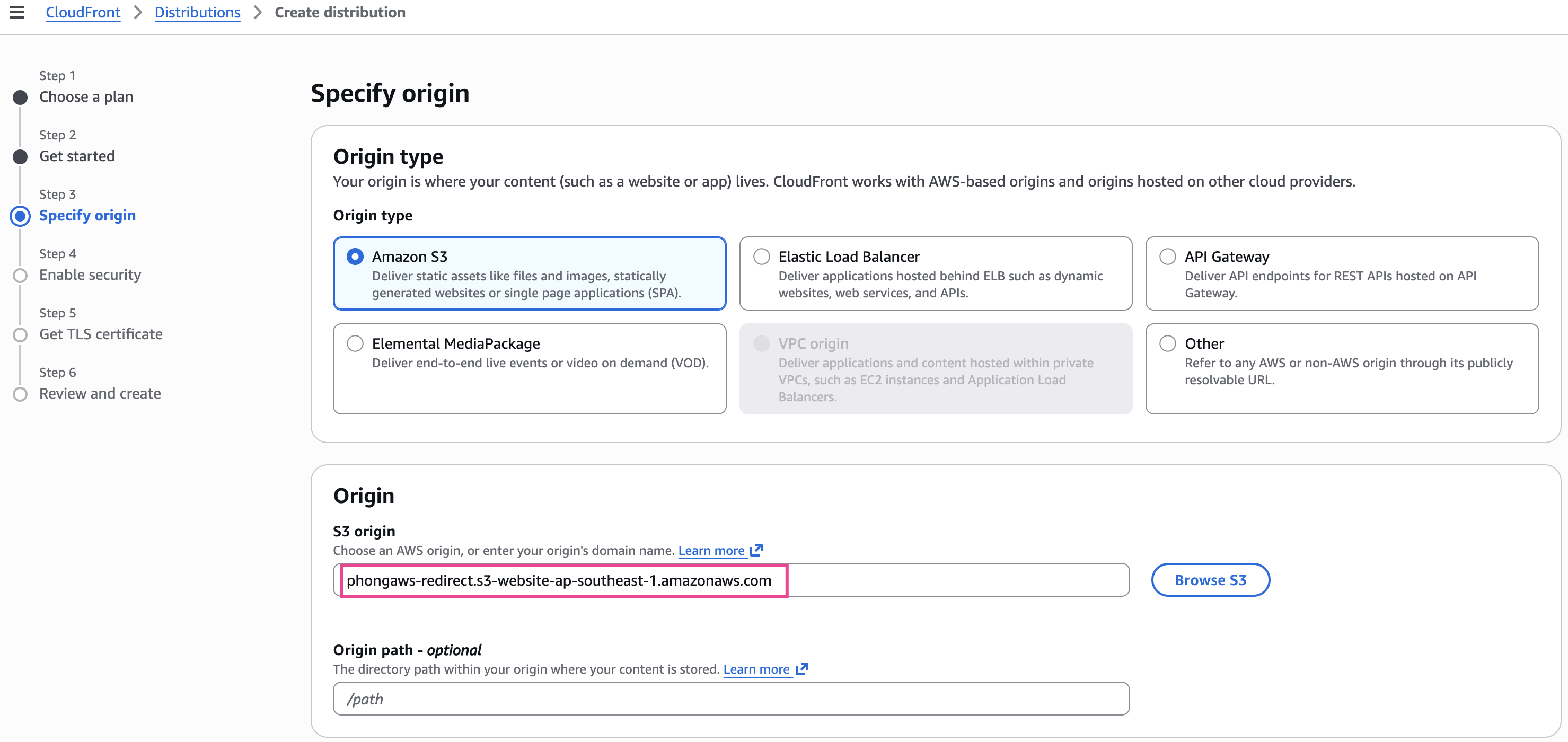 - Origin type: Chọn Amazon S3