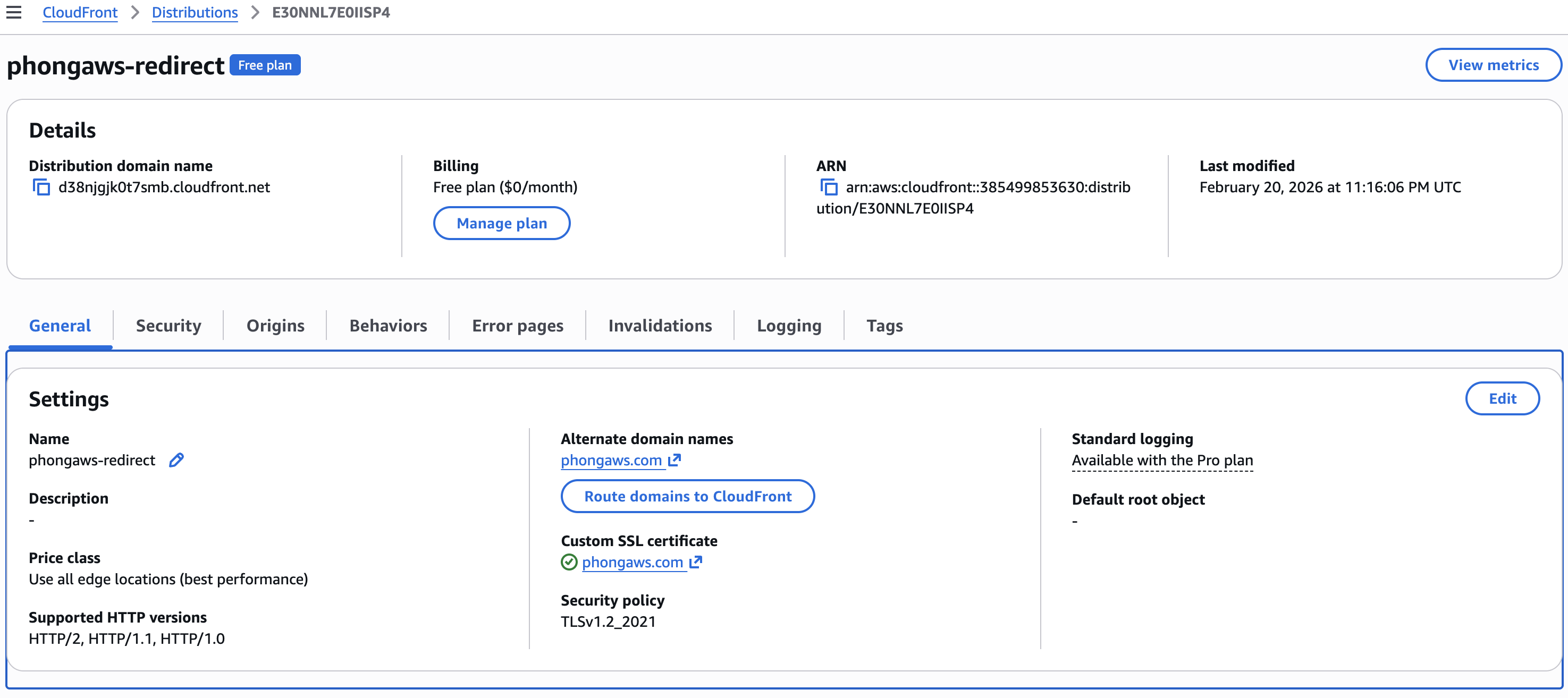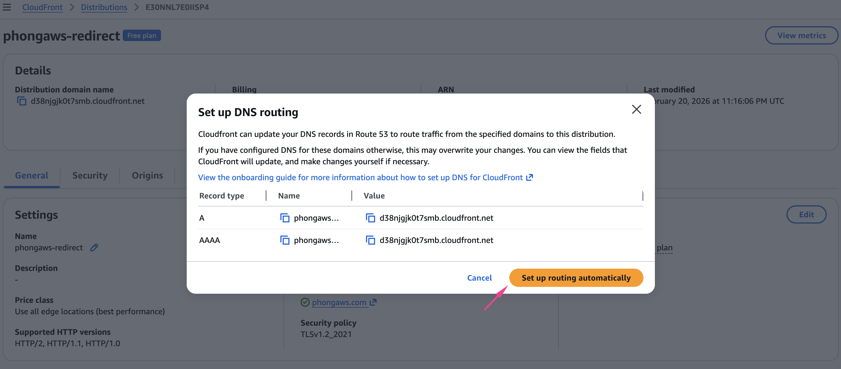 - Tab General phần Alternate domain names, Click Route domain to CloudFront -> Setup routing automatically