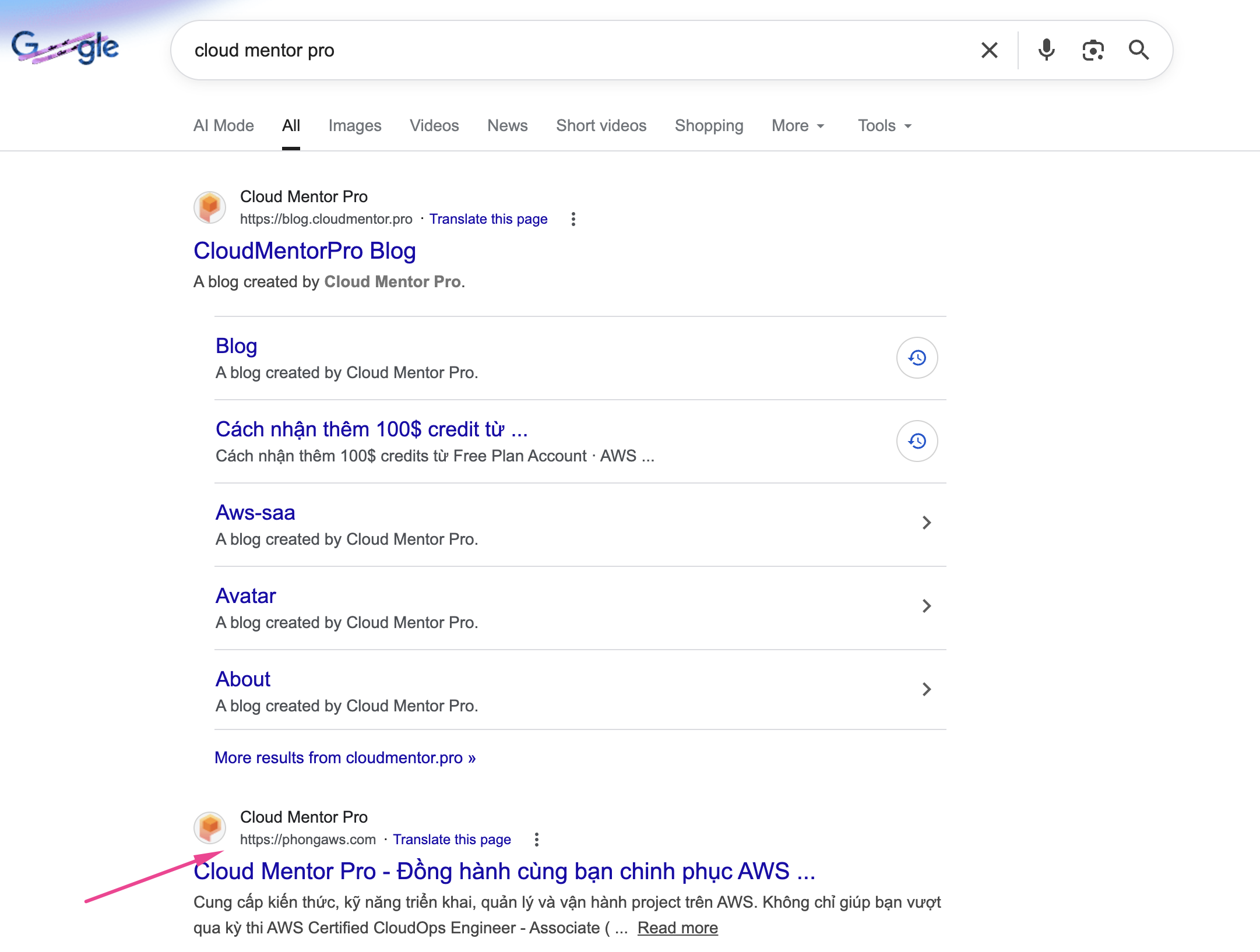 Thêm 1 nỗi đau nữa là web cloudmentor.pro của mình chưa được tối ưu hoá SEO nên cái domain phongaws.com vẫn hiển thị trong top đầu khi người dùng search google "Cloud Mentor Pro". Rất khó chịu luôn!