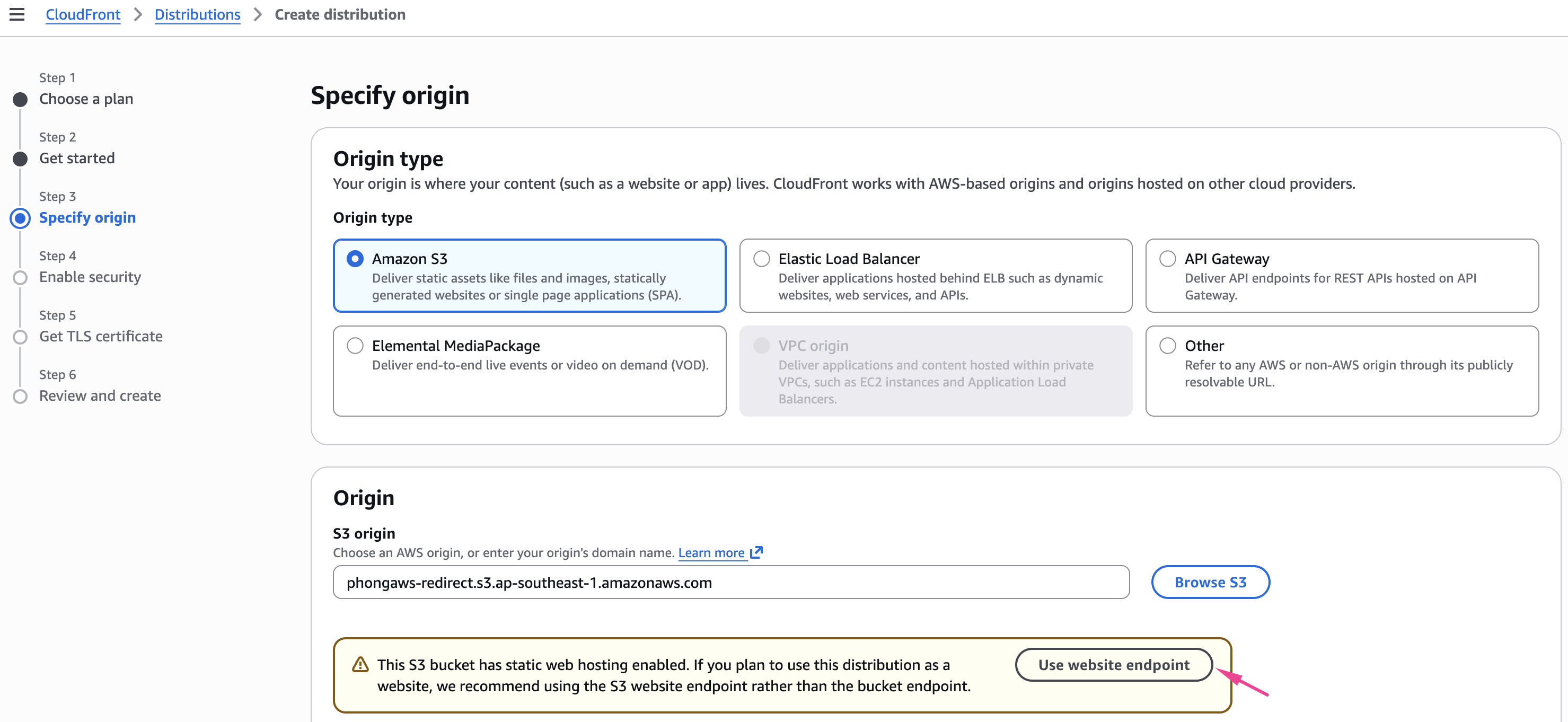 S3 origin URL sẽ thay đổi sau khi nhấn nút Use Website Endpoint. định dạng là <tên bucket của bạn>.s3-website-ap-southeast-1.amazonaws.com