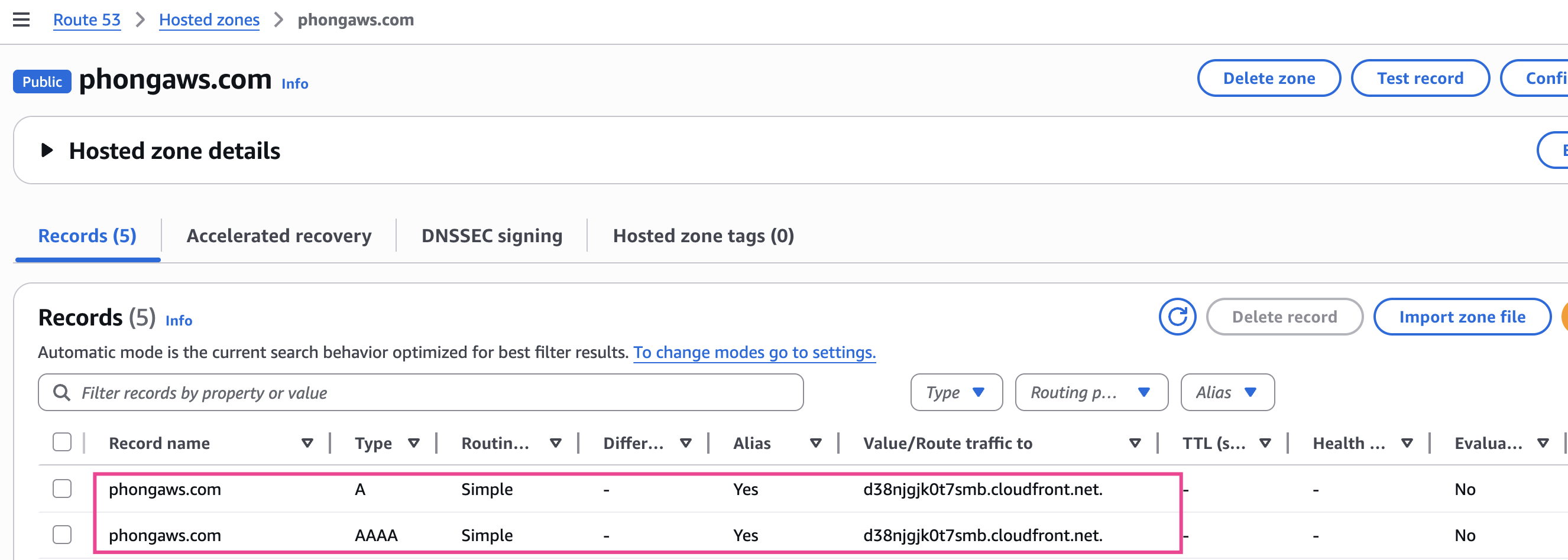 Sẽ có 3 record được tự động add vào Hosted zone cho bạn