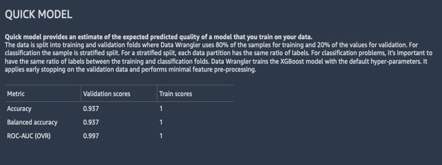 - After confirming that the data quality is acceptable, we go back to the data flow and use Data Wrangler’s Data Quality and Insights Report. This report performs an analysis on the imported dataset and provides information about missing values, outliers, target leakage, imbalanced data, and a Quick Model analysis.