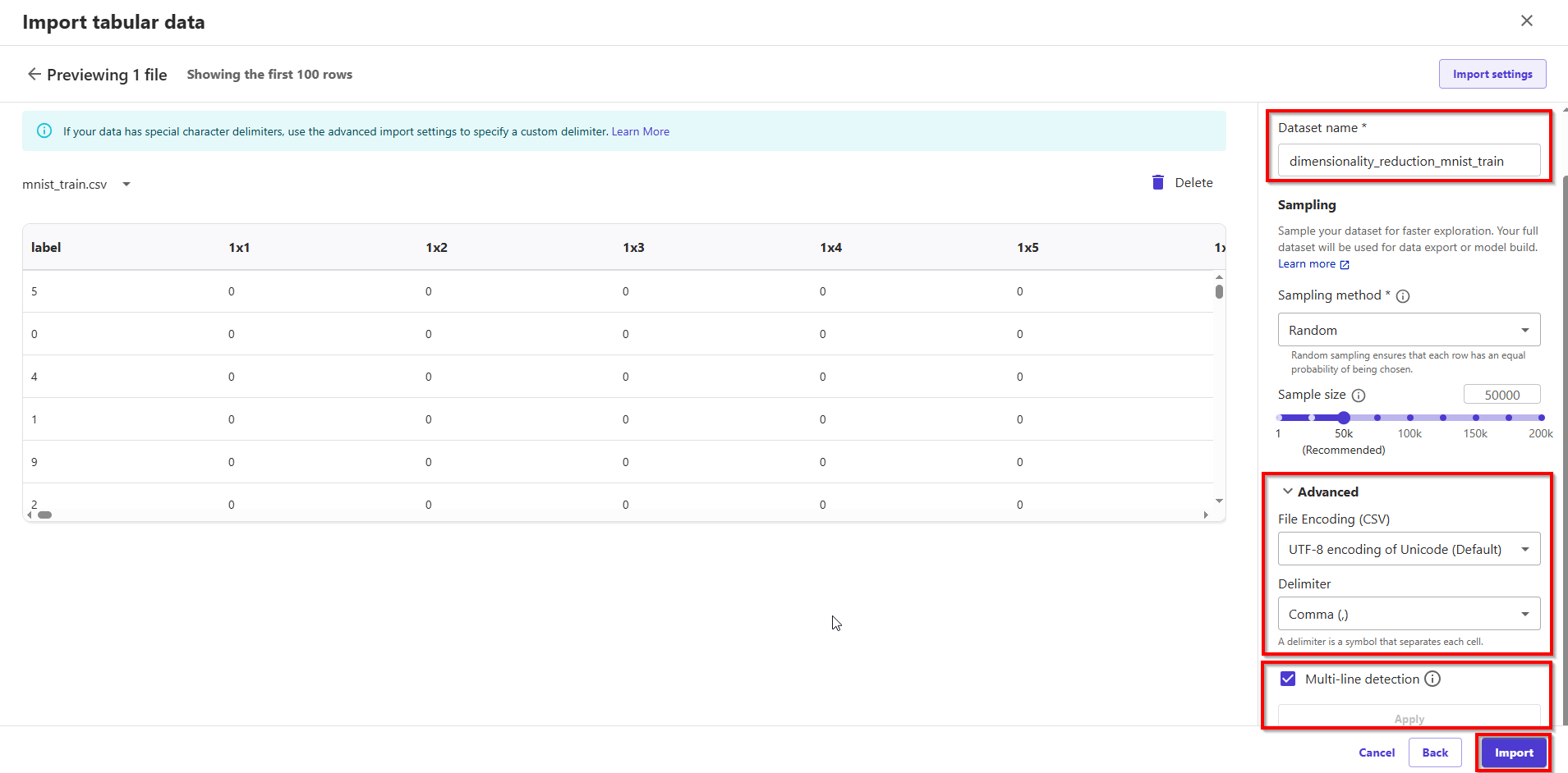 - In setting config Import tabular data, Select a data source: Local upload. Upload file: mnist_train.csv. Dataset name: dimensionality_reduction_mnist_train; Advanced: Choose UTF-8 encoding & check checkbox Multi-line detection. Finally, choose button Import.