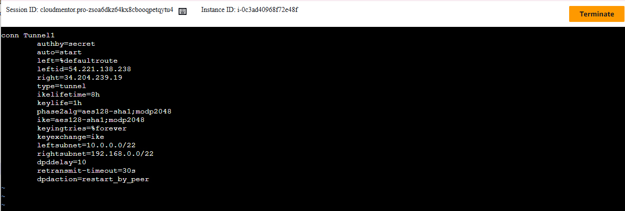 /etc/ipsec.d/aws.confconn Tunnel1 authby=secret auto=start left=%defaultroute leftid=54.221.138.238 # Giữ nguyên thông tin này right=34.204.239.19 # Giữ nguyên thông tin này type=tunnel ikelifetime=8h keylife=1h phase2alg=aes128-sha1;modp2048 # Thay 1024 thành 2048 ike=aes128-sha1;modp2048 # Thay 1024 thành 2048 auth=esp # Xóa dòng này keyingtries=%forever keyexchange=ike leftsubnet=10.0.0.0/22 # left là phía On-premise, 10.0.0.0/22 như trong Cloudformation rightsubnet=192.168.0.0/22 # right là phía AWS, 192.168.0.0/22 như trong Cloudformation dpddelay=10 dpdtimeout=30 # Xóa dòng này retransmit-timeout=30s # Thêm dòng này dpdaction=restart_by_peer