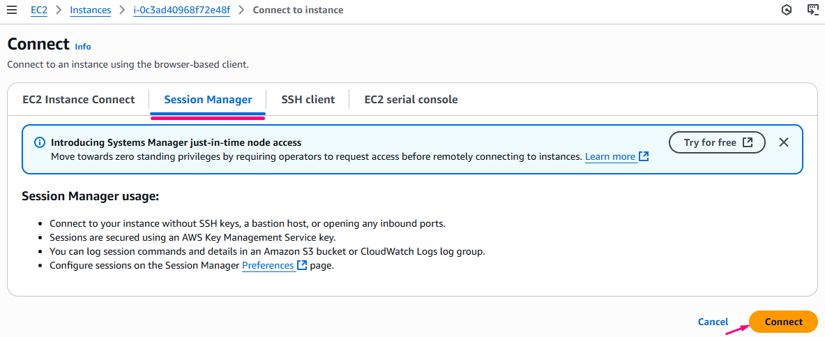Sử dụng AWS Systems Manager Session Manager để đăng nhập vào SOA-S2S-VPN-Onpre-Public-EC2 (giả lập On-premise Customer gateway)