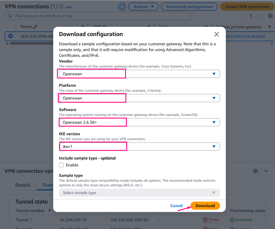 AWS Site-to-Site VPN cho phép tải xuống mẫu cấu hình cho thiết bị VPN phía on-premise. Phía on-premise sẽ sử dụng phần mềm VPN Libreswan, nhưng do không có mẫu tương ứng nên chúng ta sẽ tải xuống mẫu cấu hình của Openswan tương tự.