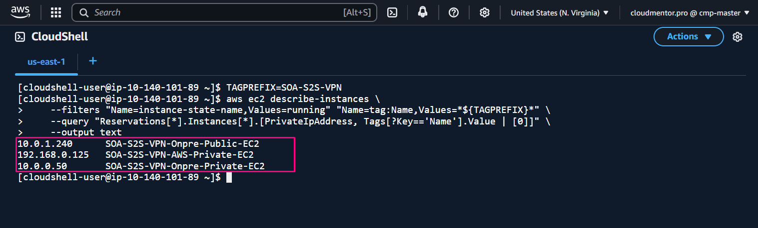 Tại CloudShell, chạy command sau để lấy thông tin IP của các Server
