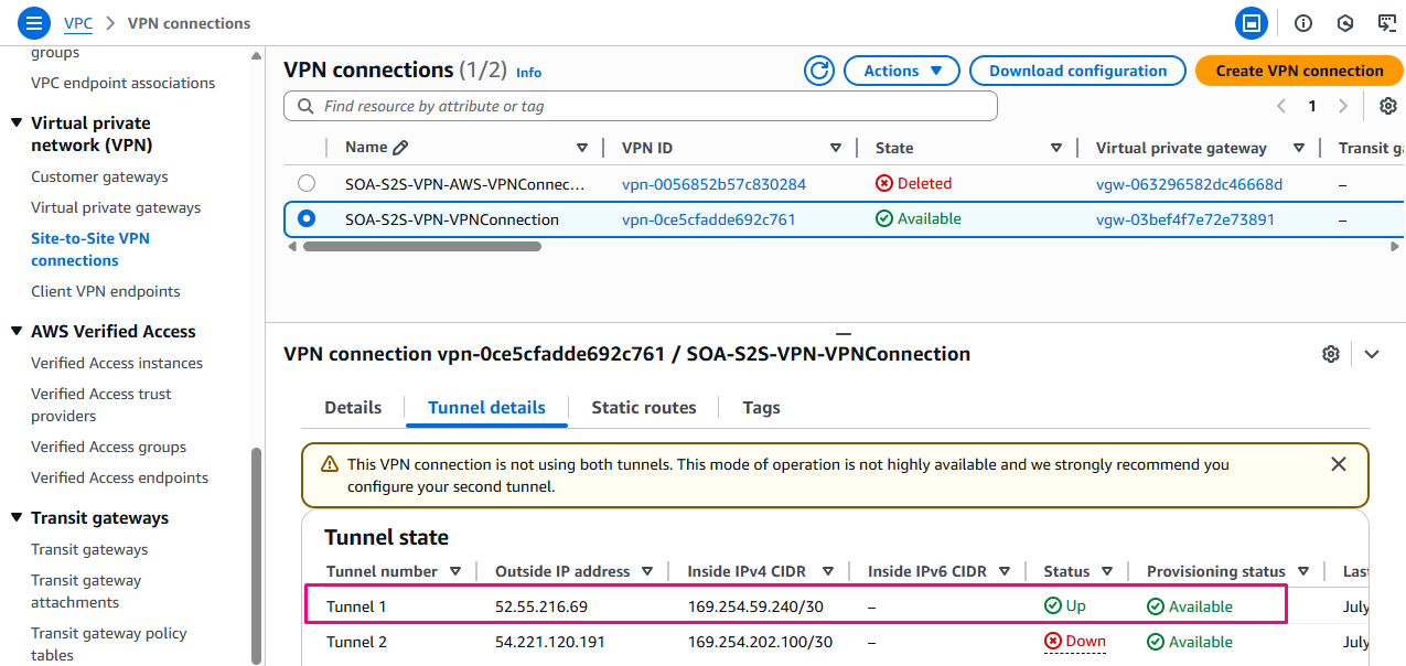 Confirm status của Site-to-Site VPN Tunnel 1 đã Active chưa.