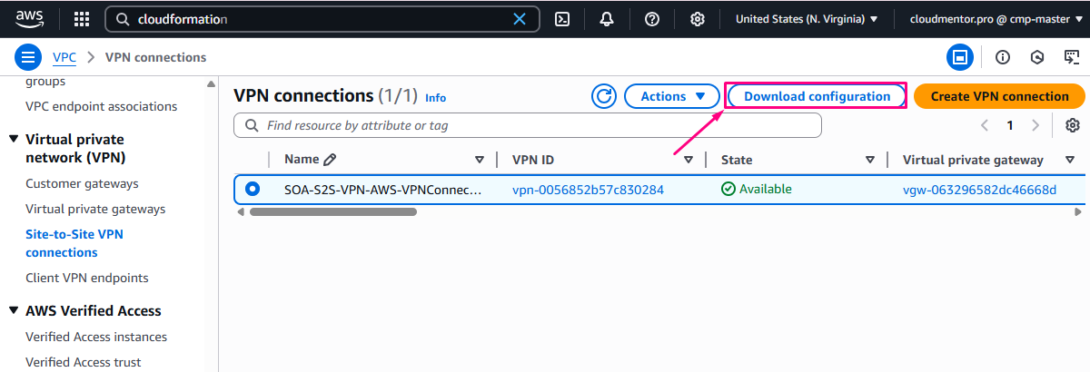- Services used: VPC resource, EC2, IAM, Customer Gateway, Vitual Private Gateway, Site-To-Site VPN