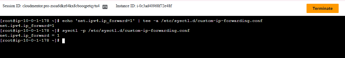 echo 'net.ipv4.ip_forward=1' | tee -a /etc/sysctl.d/custom-ip-forwarding.conf sysctl -p /etc/sysctl.d/custom-ip-forwarding.conf