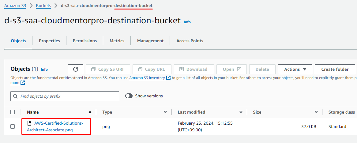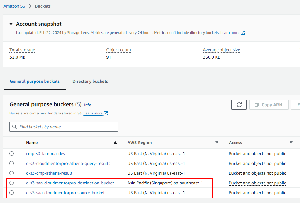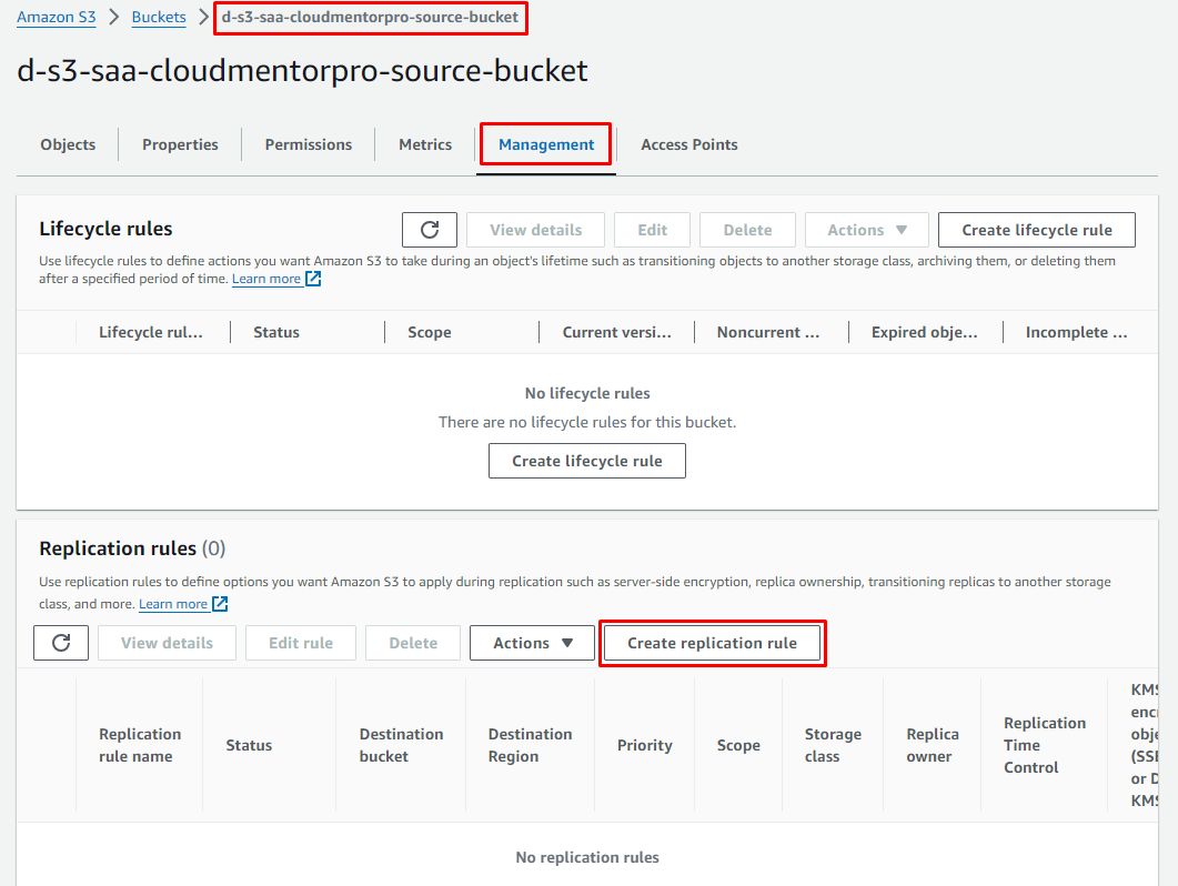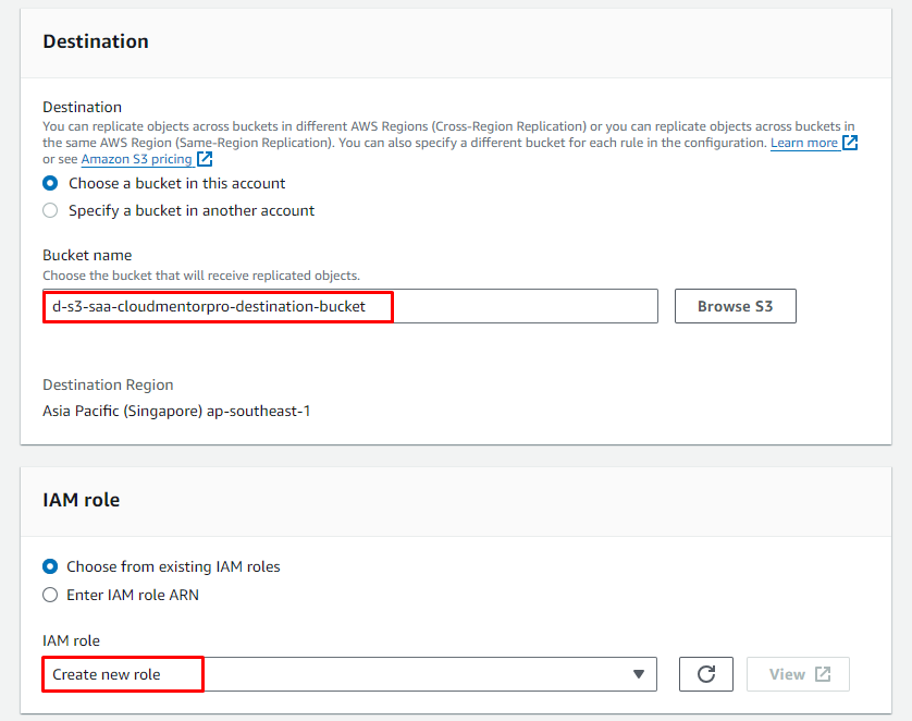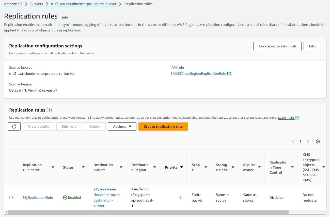 d-s3-saa-[your-name]-destination-bucket(Ex:d-s3-saa-cloudmentorpro-destination-bucket) - Bucket Versioning: Enable