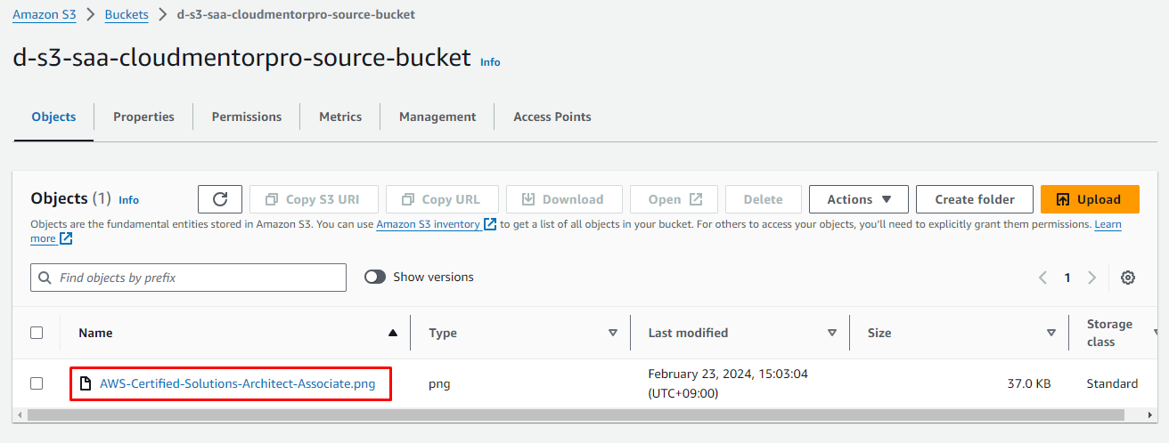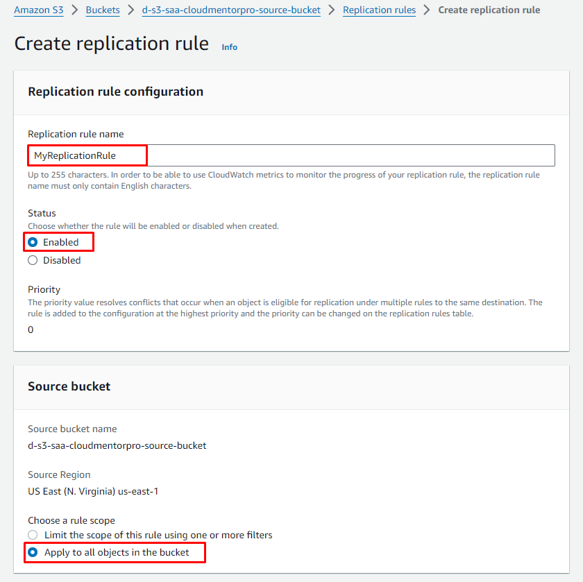 d-s3-saa-[your-name]-source-bucket(Ex:d-s3-saa-cloudmentorpro-source-bucket) - Bucket Versioning: Enable