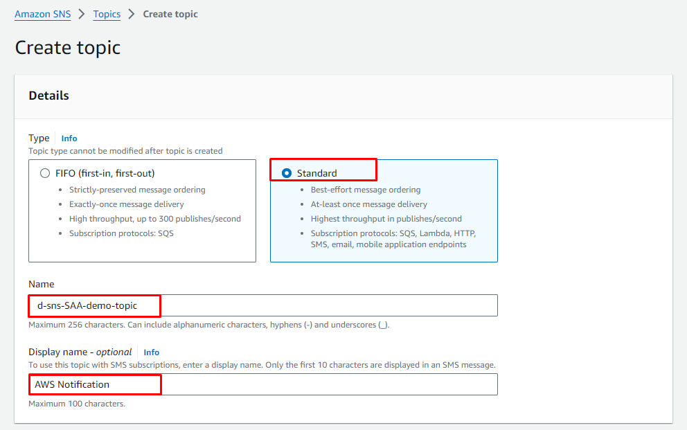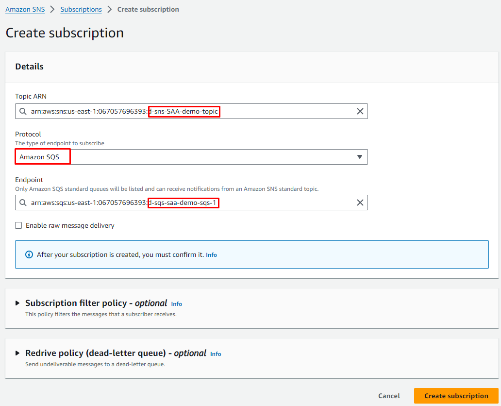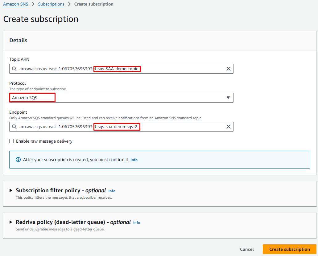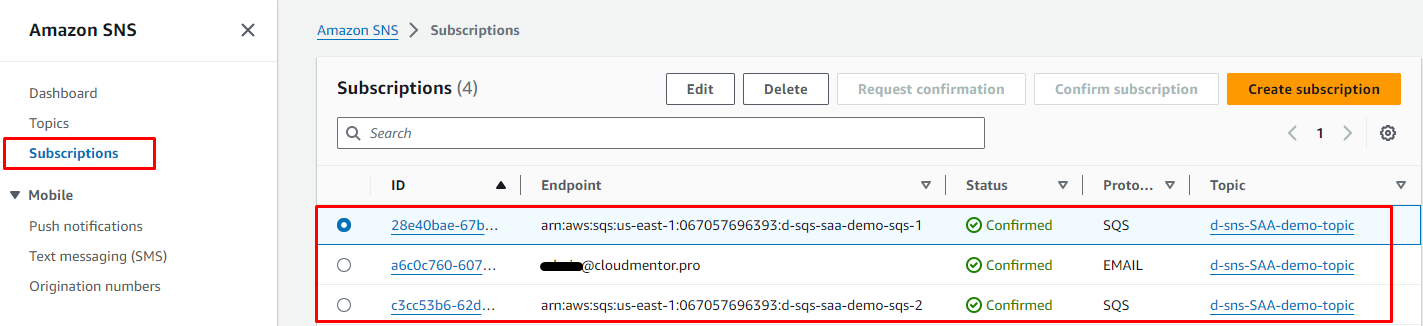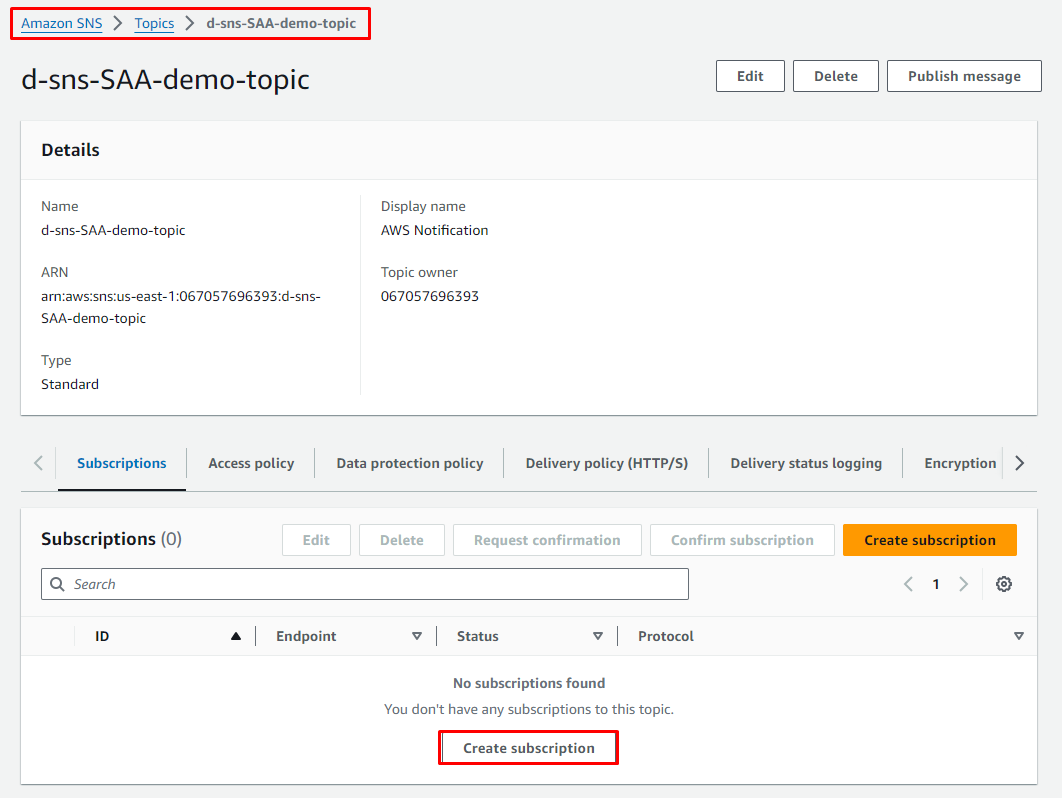Vào Console SNS -> Topic -> Click vào topic vừa tạo (d-sns-SAA-demo-topic) -> Create subscription: