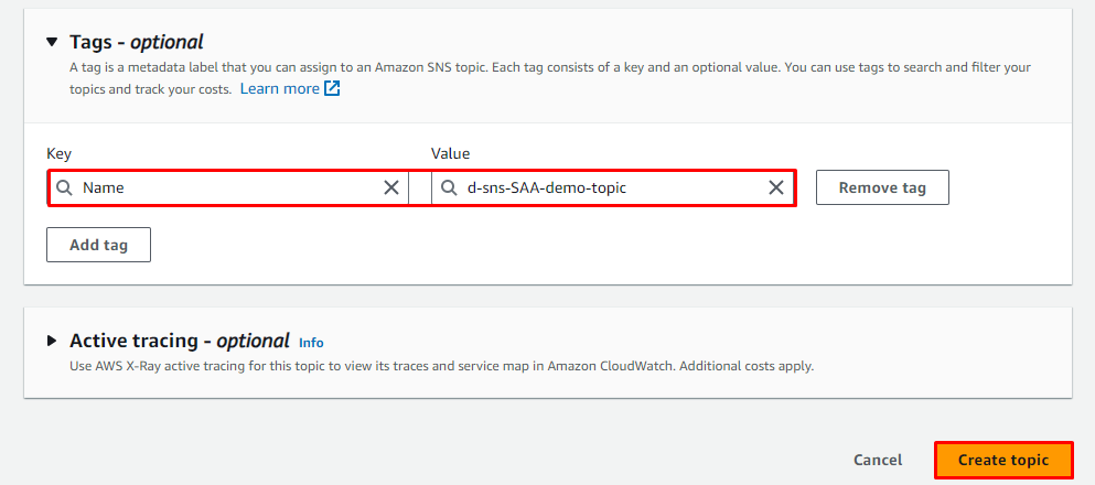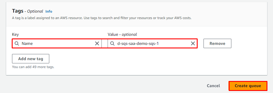 Advanced-> Edit policy chổ Principal cho phép user / service nào cũng có thể gửi message đến SQS"Principal": { "AWS": "*" }, - Tags - optional: