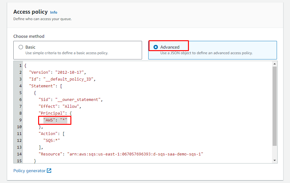 d-sqs-saa-demo-sqs-1 - Access policy: