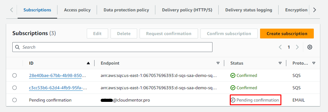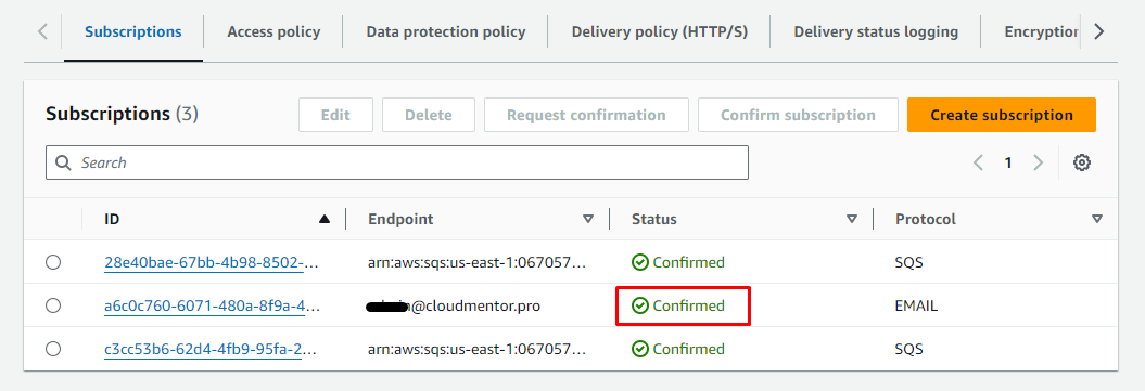 Sau khi hoàn thành thì trạng thái của subscription như bên dưới. Endpoint email đang