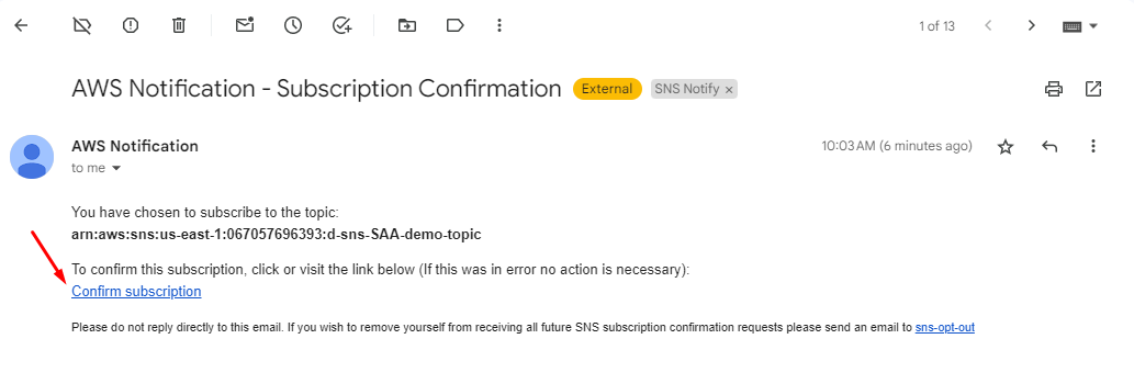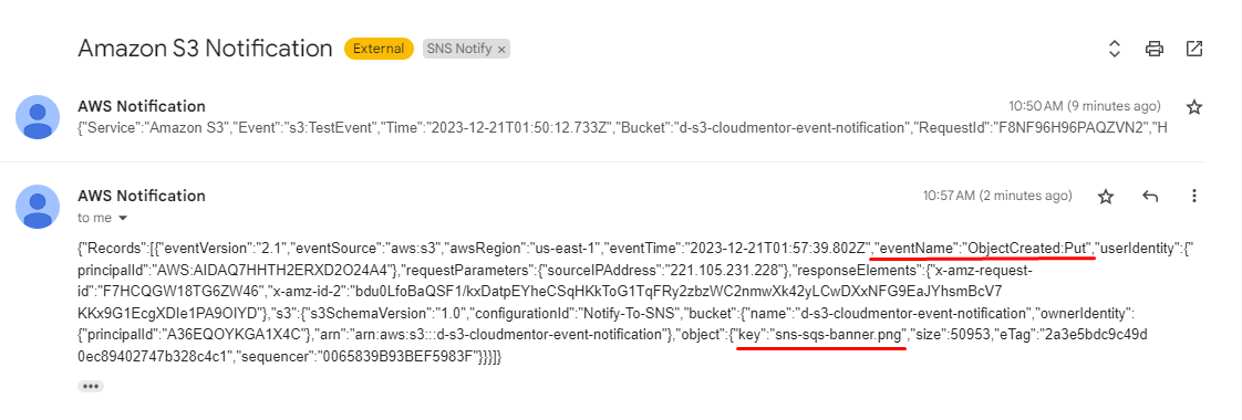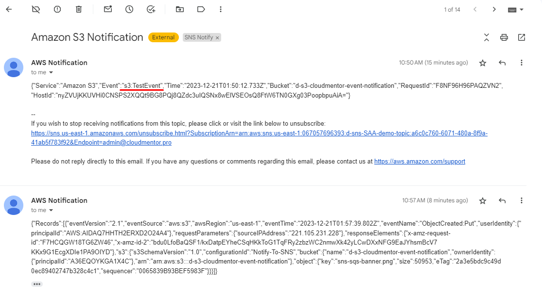 Nếu bạn để ý thì bạn cũng nhận dc 1 email trước đó, đó là email Test dc gửi từ S3 event notification lúc mới setp xong.