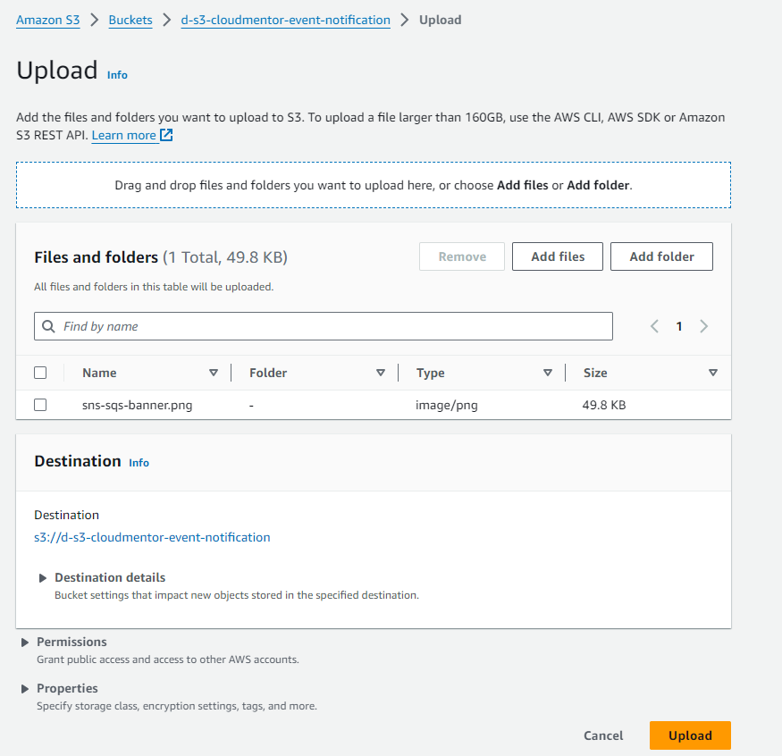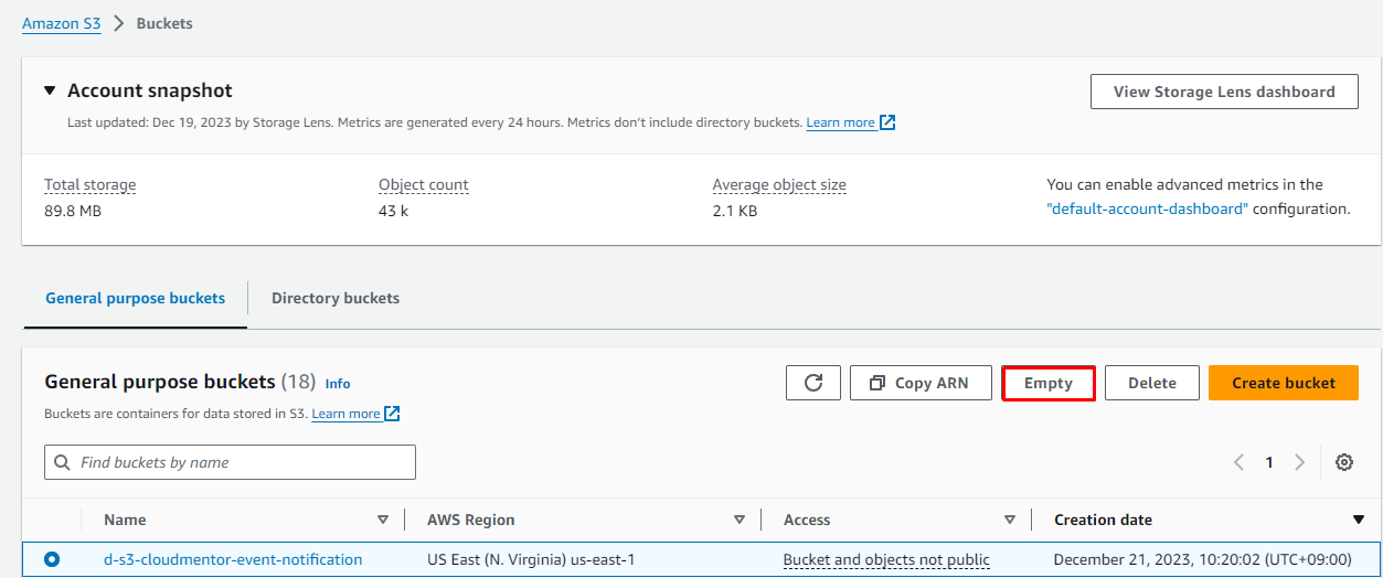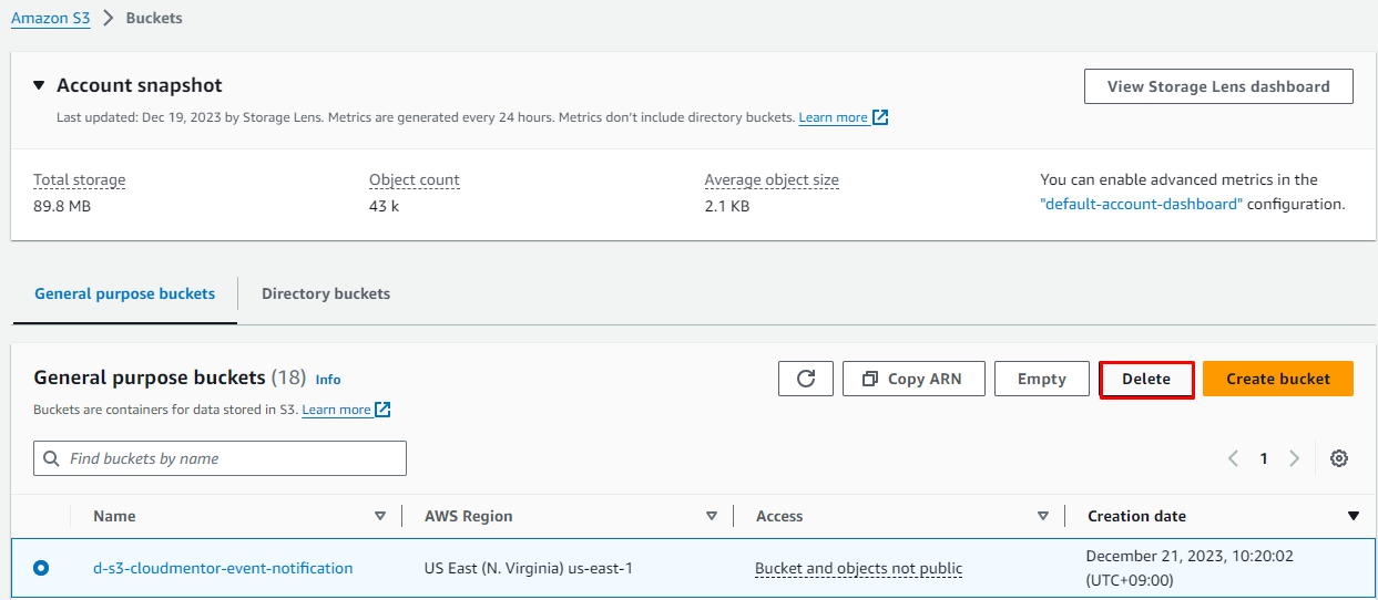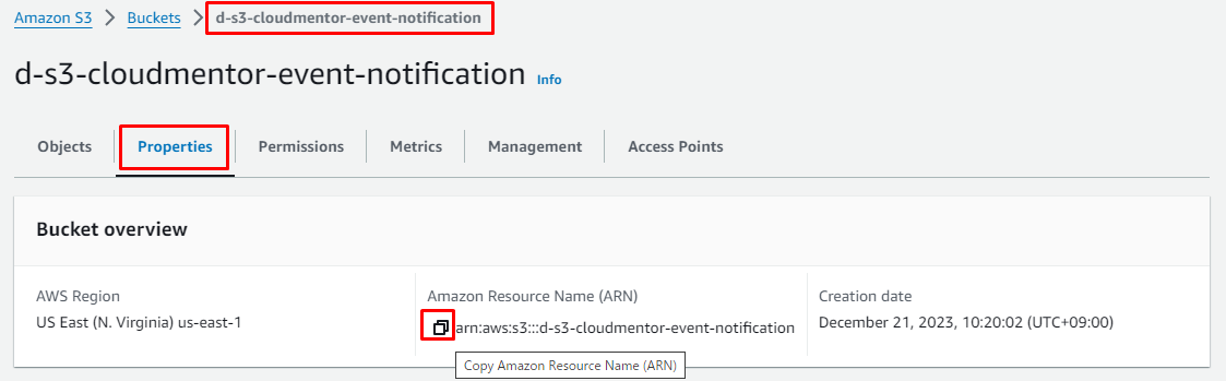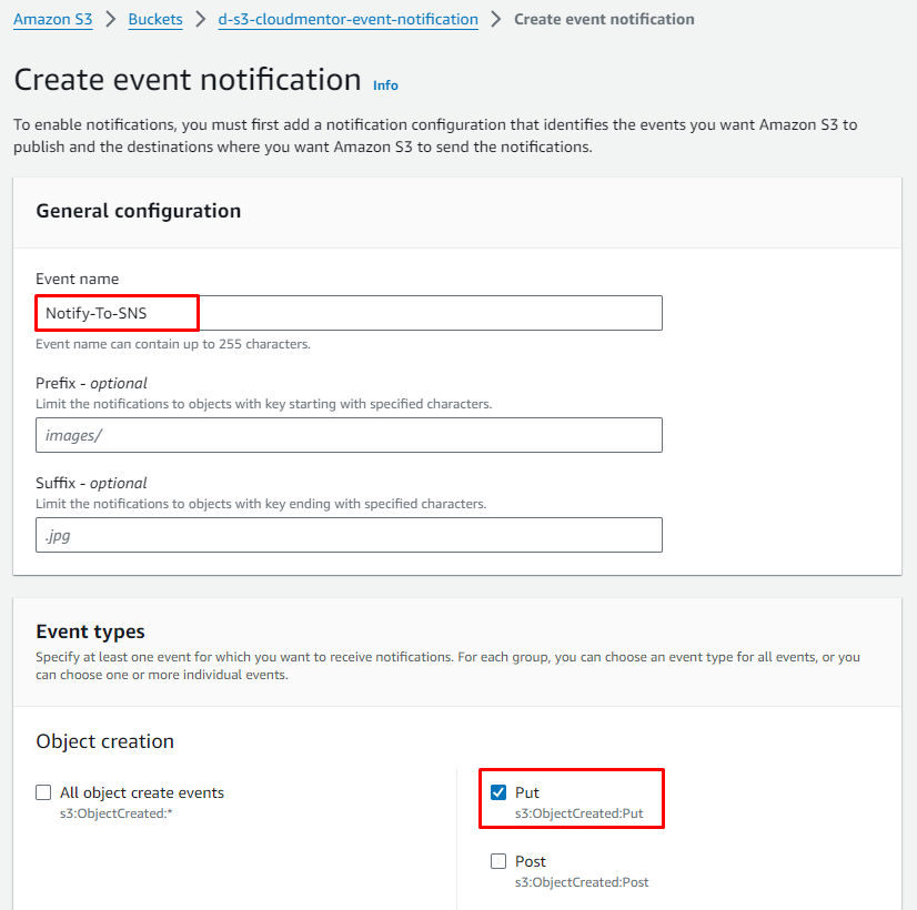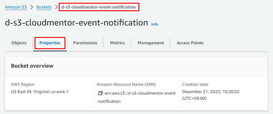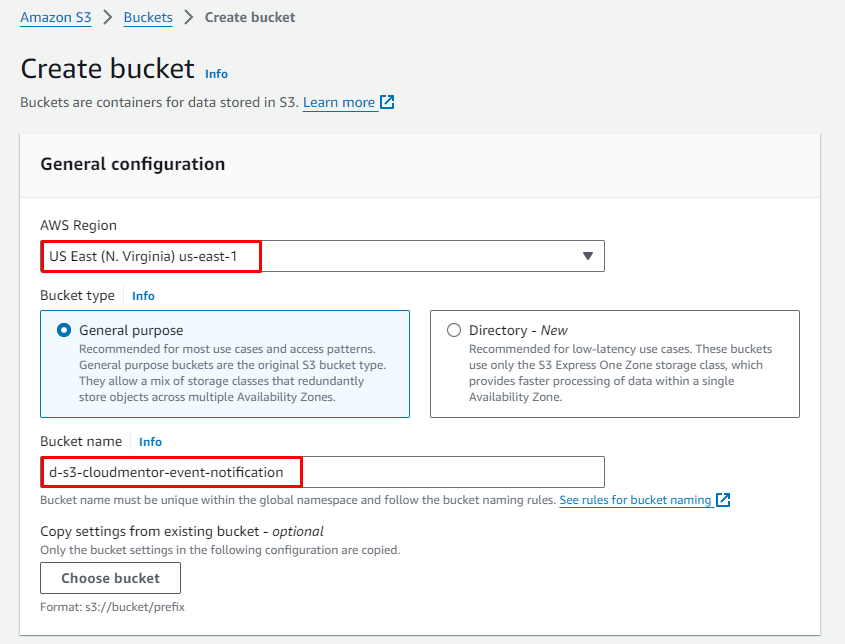 d-s3-cloudmentor-event-notification(Note: The Bucket Name must be unique across all existing bucket names in Amazon S3)