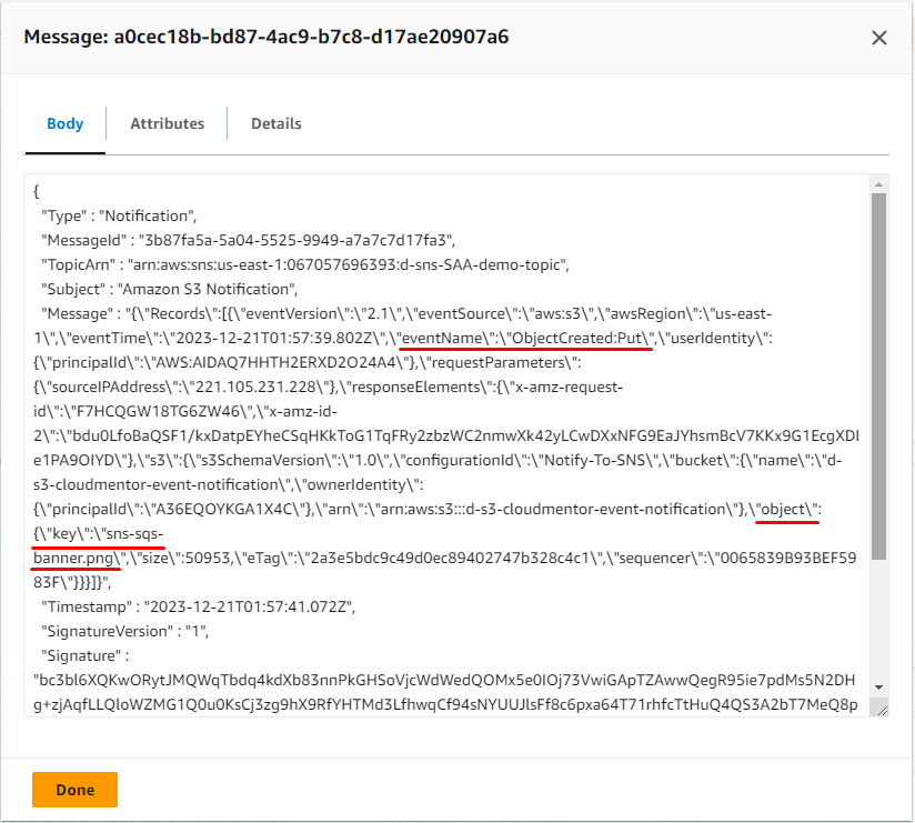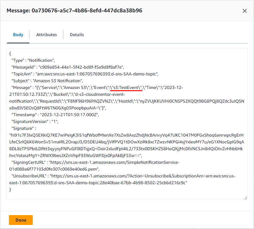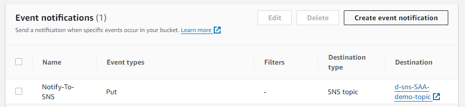 Bây giờ, S3 bucket đã được enabled event notifications cho việc putting new objects thông qua SNS topic.