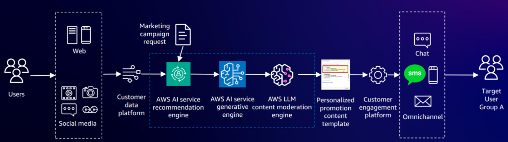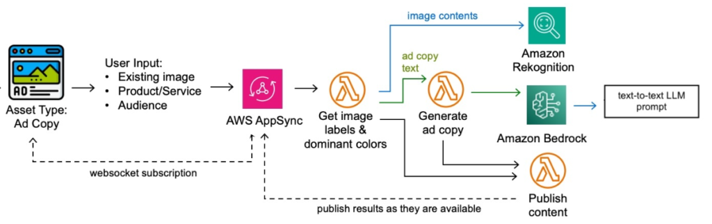 - Amazon Bedrock, nền tảng xử lý mô hình ngôn ngữ AI của AWS, được sử dụng để tạo nội dung quảng cáo tự động dựa trên prompt.