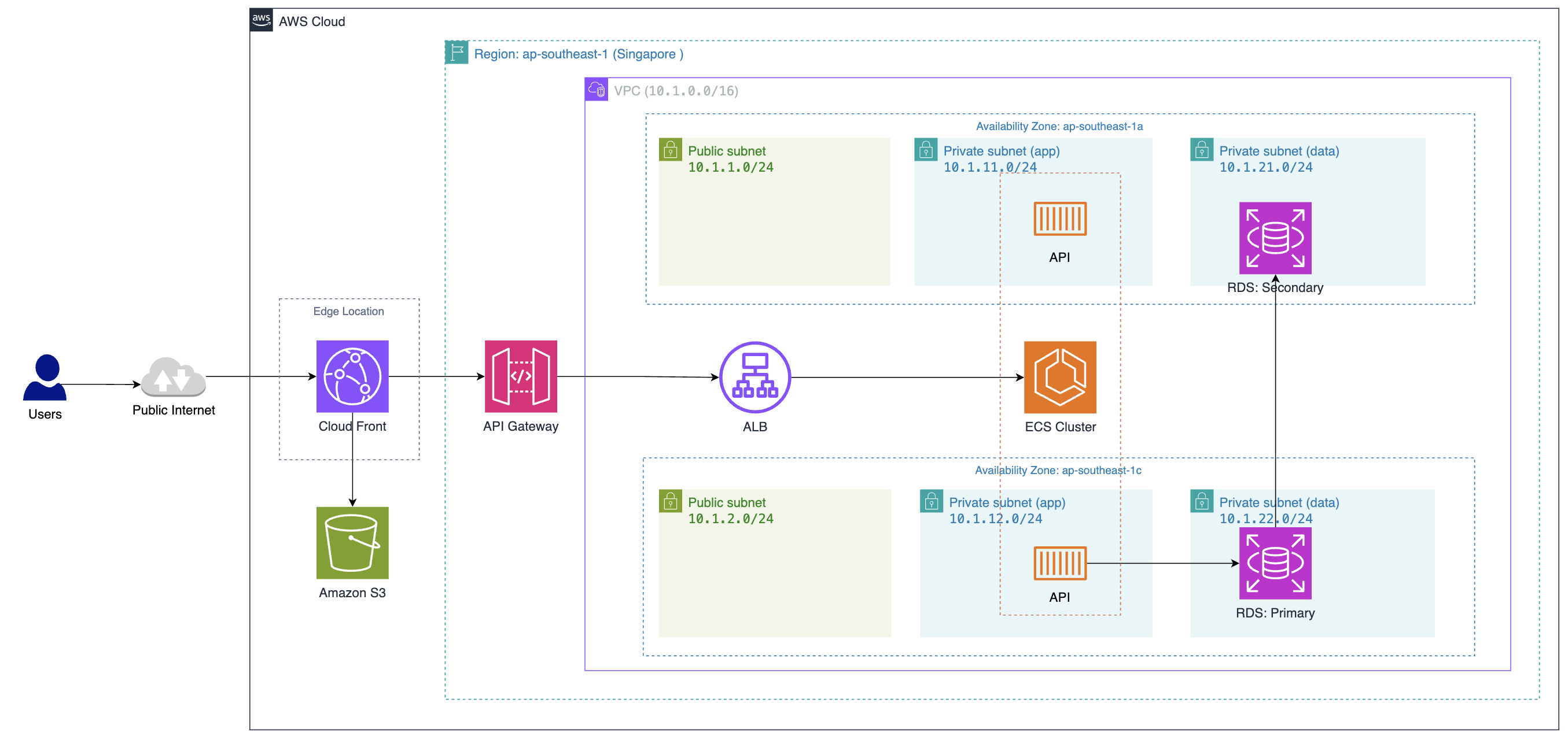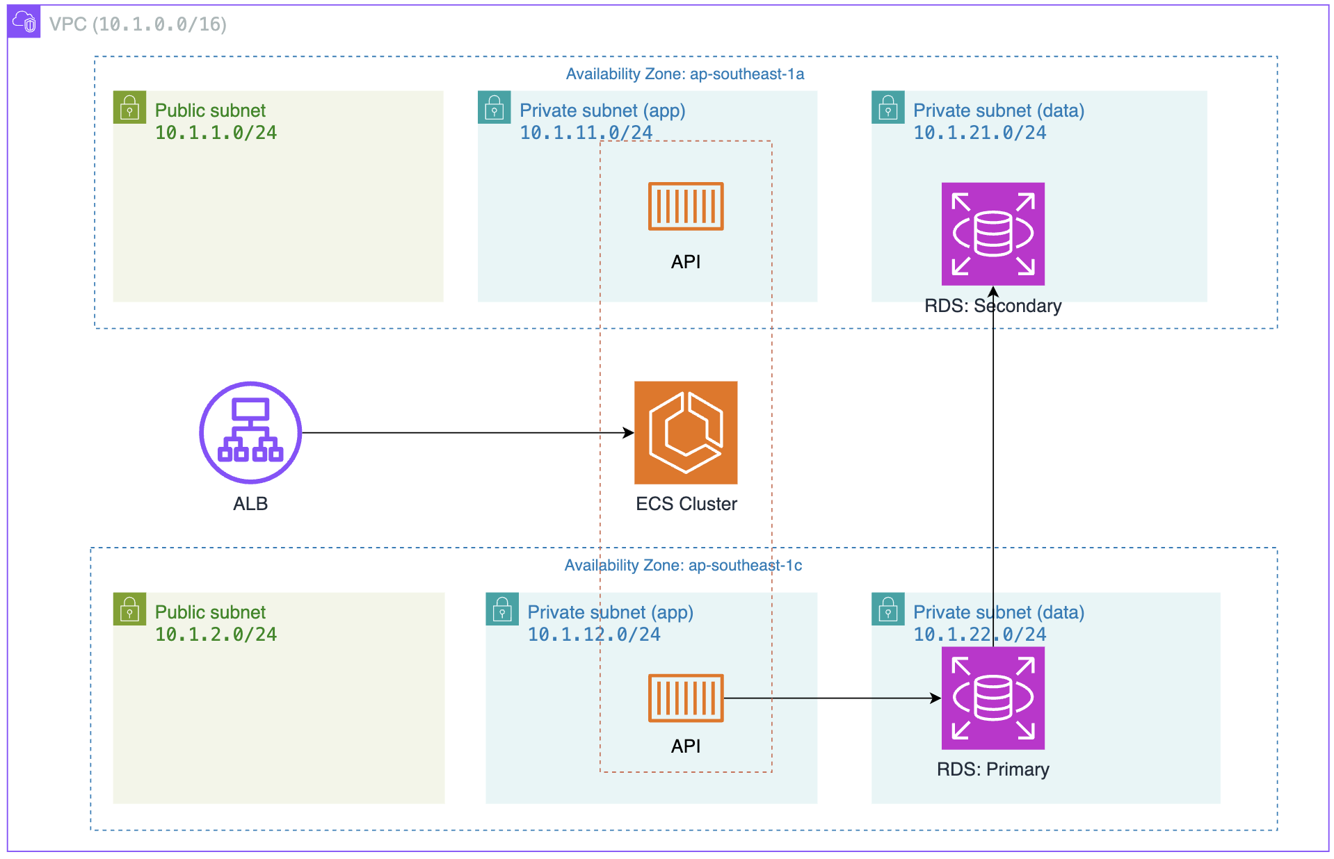 Ví dụ thực tế từ CloudExam.pro: VPC của mình dùng CIDR 10.1.0.0/16, được thiết kế với Multi-AZ architecture, trong đó có: