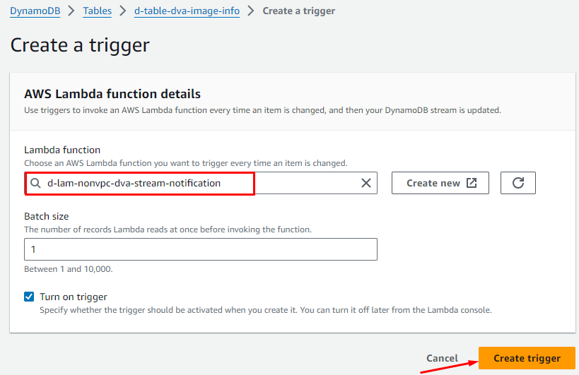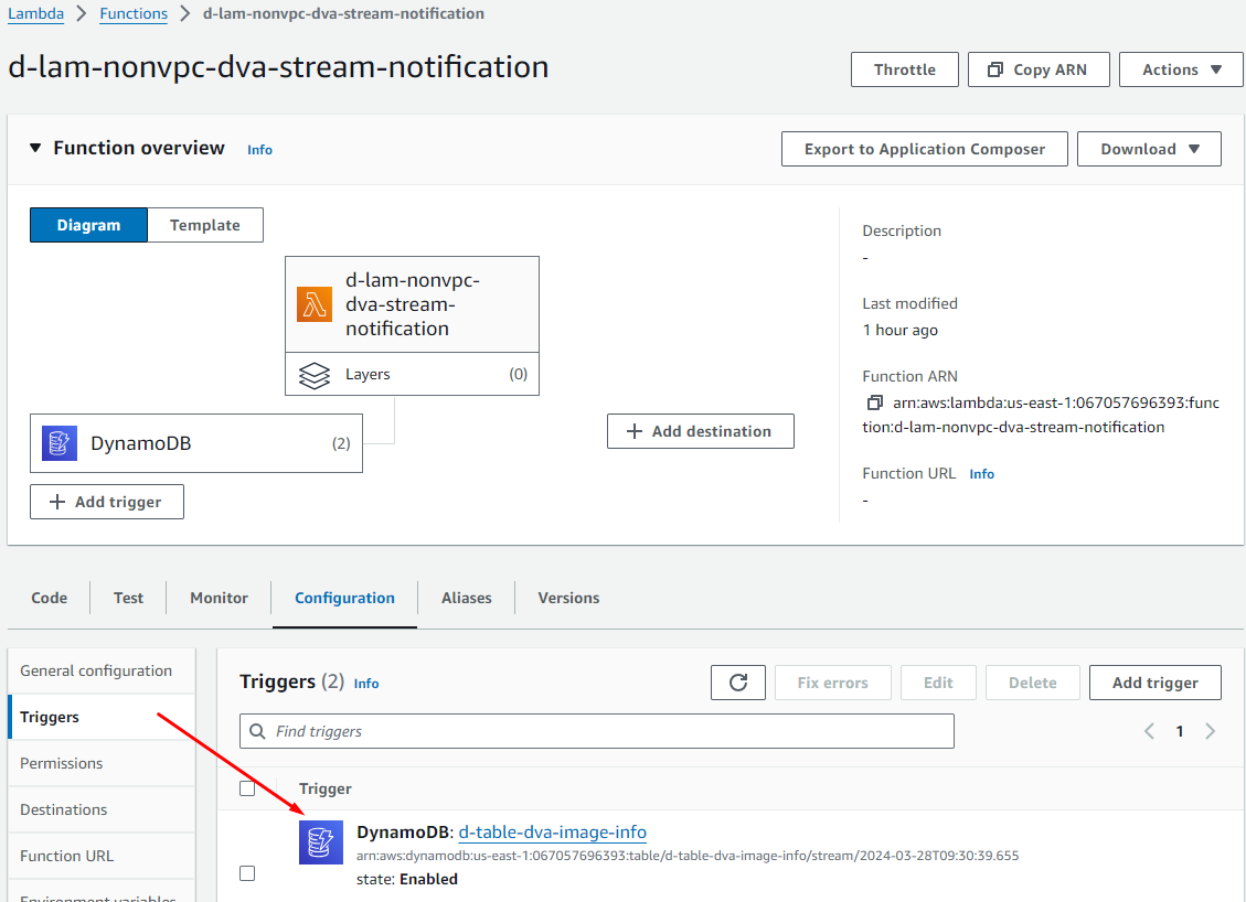 Lambda d-lam-nonvpc-dva-stream-notification được trigger từ DynamoDB Stream