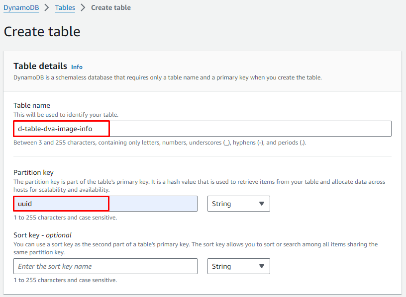 Tại Console DynamoDB -> Menu Tables -> Create Table