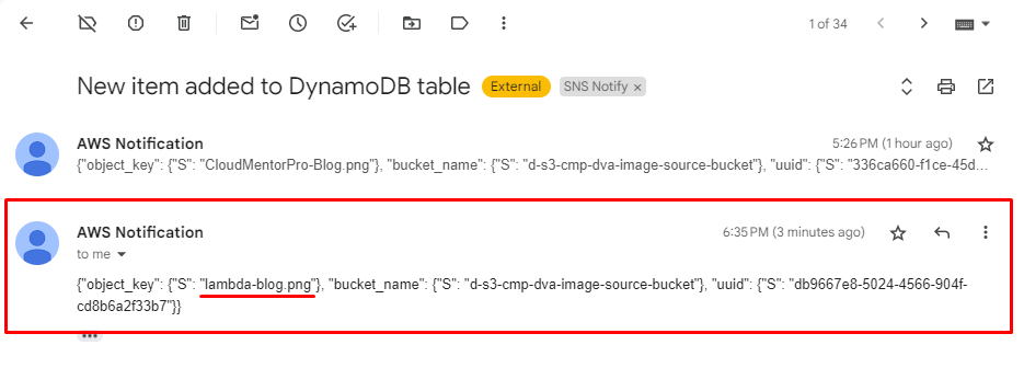Upload vài image lên s3 bucket và kiểm tra thông tin có được ghi vào DynamoDB không, đồng thời kiểm tra có nhận được email chưa. Nếu chưa nhận được email, kiểm tra log của lambda d-lam-nonvpc-dva-stream-notification có lỗi gì không. Nếu vẫn chưa thấy log thì có thể đợi 1-2p lý do DynamoDB Stream vừa tạo có thể chưa được kích hoạt ngay. Thử lại bằng việc upload image.