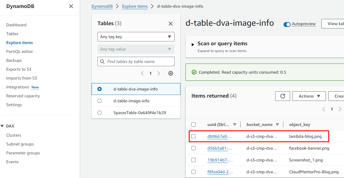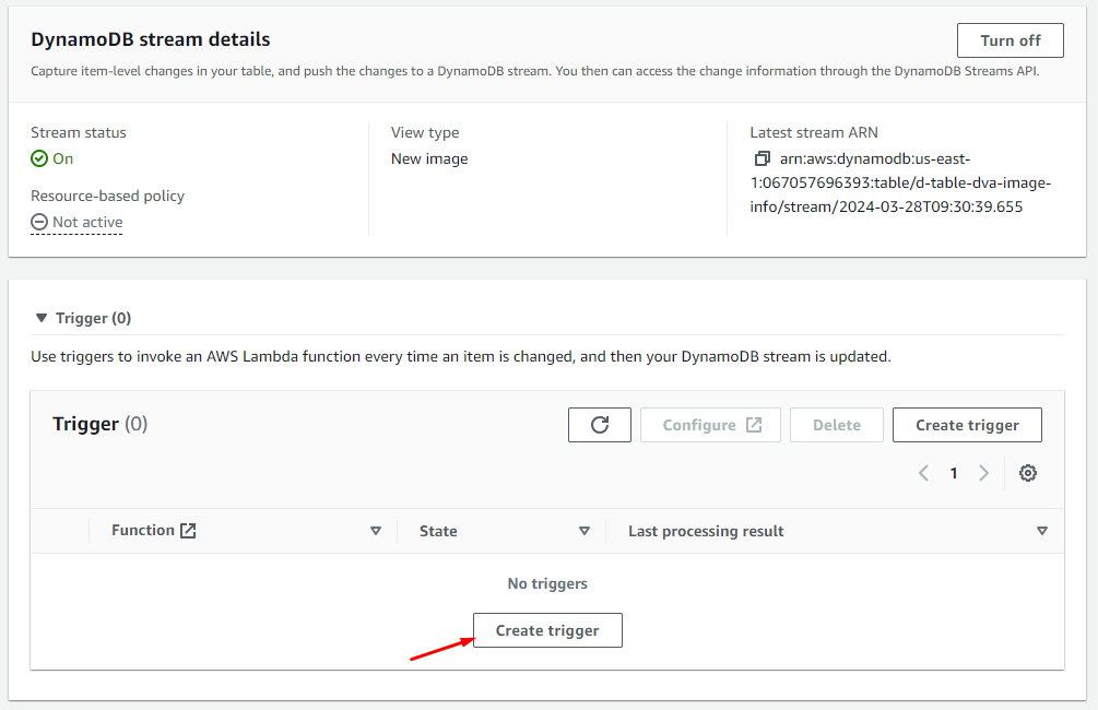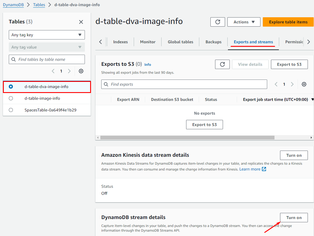 - Tại DynamoDB Console -> Menu Table -> Chọn table d-table-dva-image-info, Tab Exports and streams