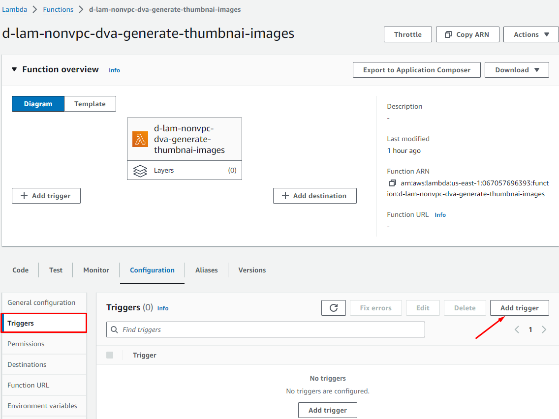 - Execution role: Use an existing role -> DVALambdaGenerateThumbnailImageRole