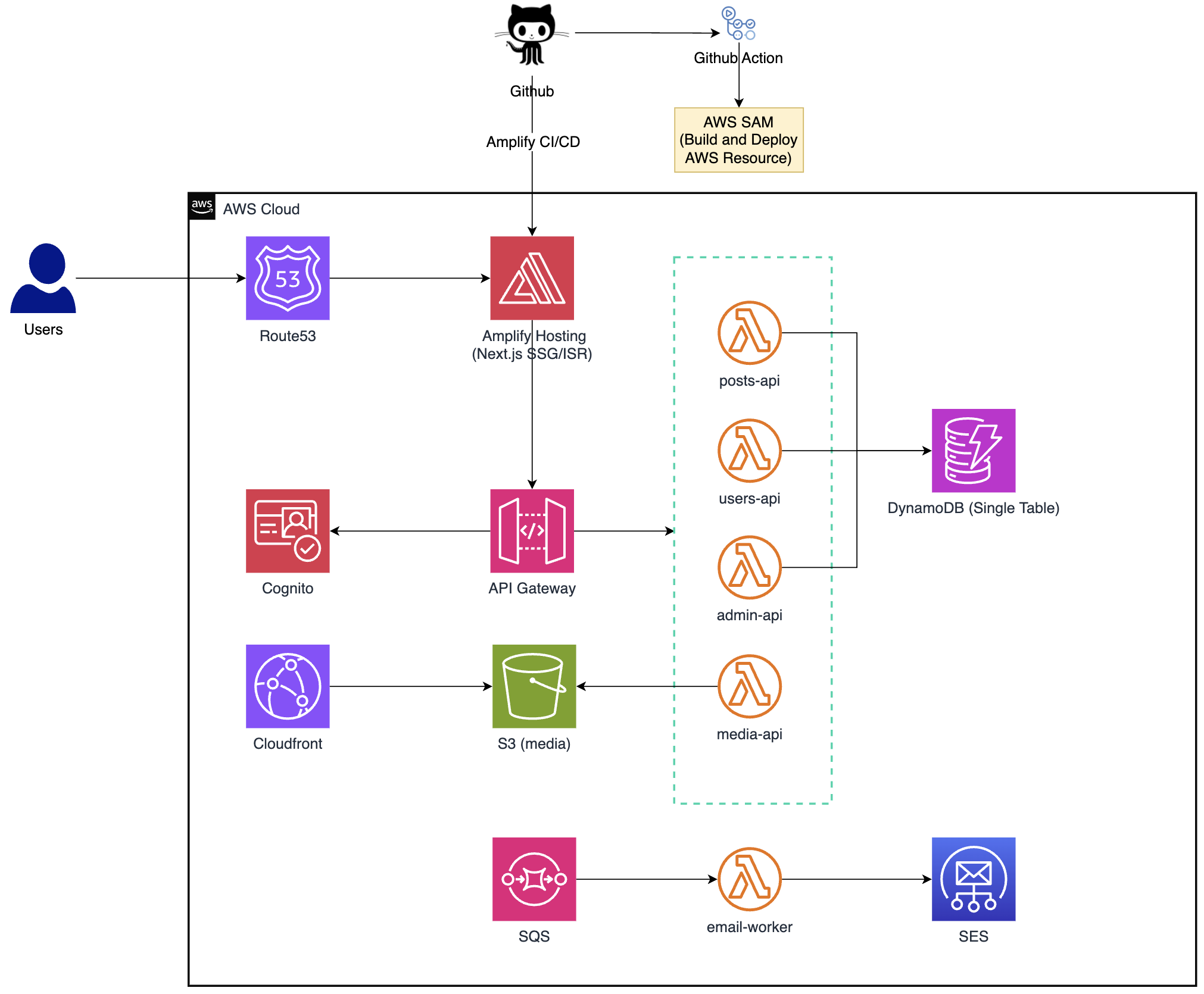| Amplify Hosting | Deploy Next.js frontend | CI/CD tự động từ GitHub, hỗ trợ SSG + ISR |