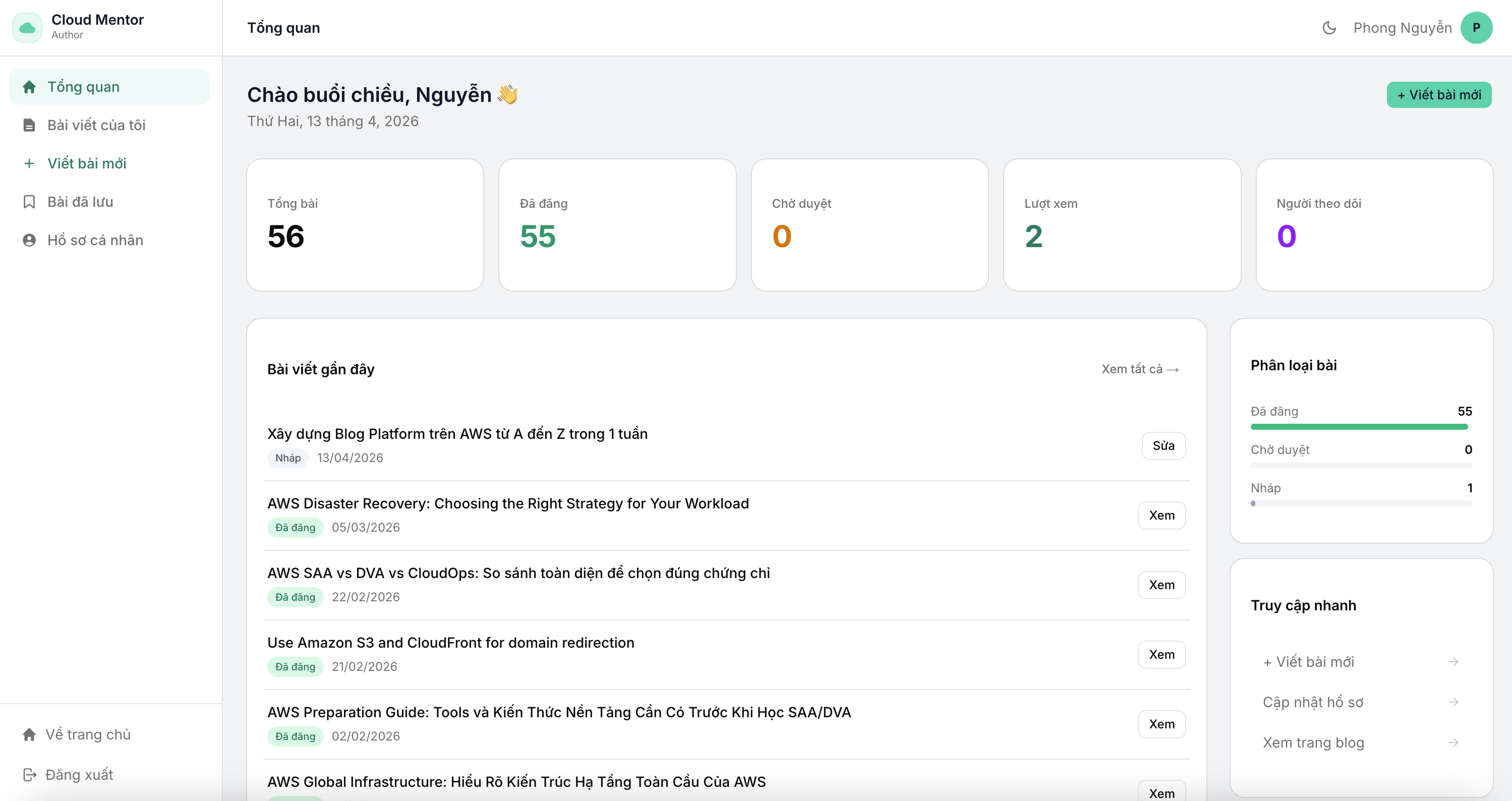- Dashboard cá nhân: thống kê bài viết, lượt xem, số người theo dõi
